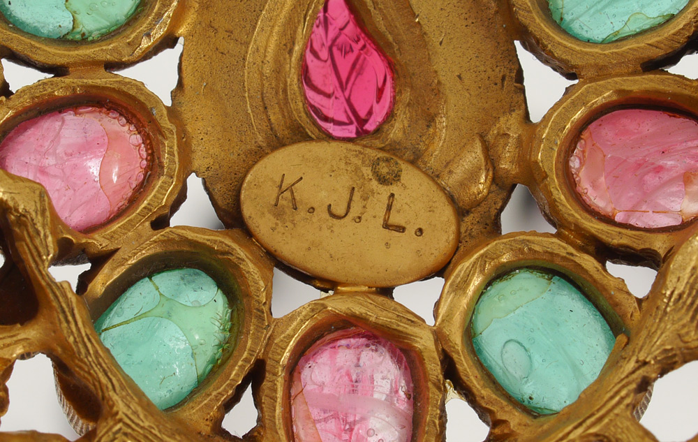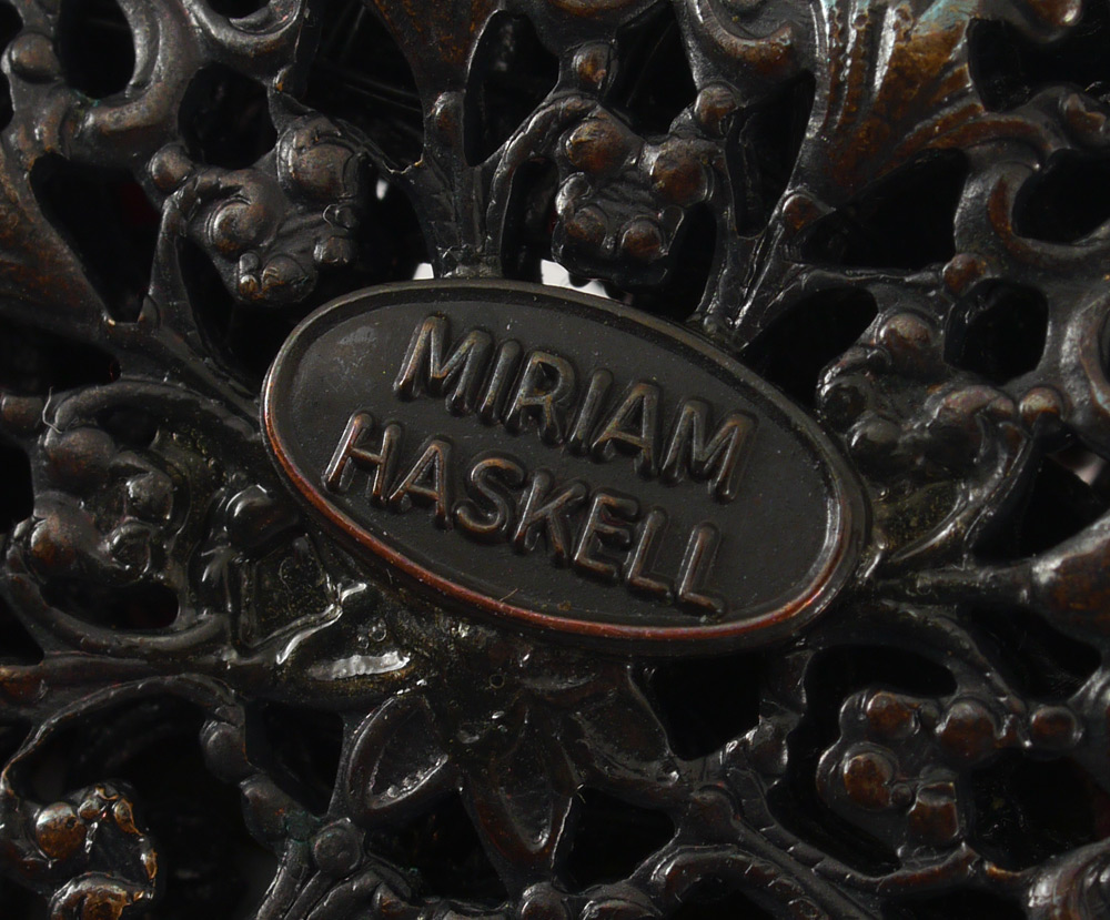 MIRIAM HASKELL AND KJL COSTUME JEWELRY: 1) Miriam Haskell black, red and white glass bead pendant necklace and earrings. Signed on clasp and pendant. Necklace is 30'' length with 2'' pendant. 2) Kenneth J Lane bead and cabochon brooch, 2 7/8'' length, signed KJL.
