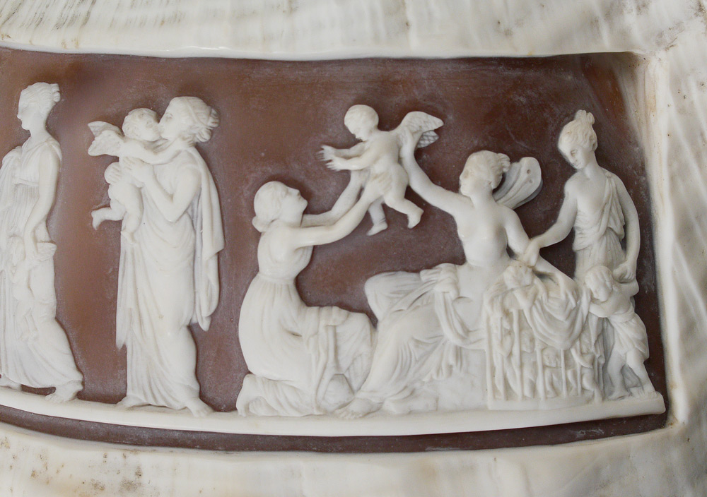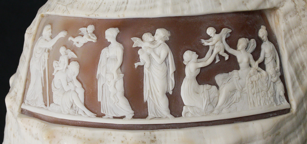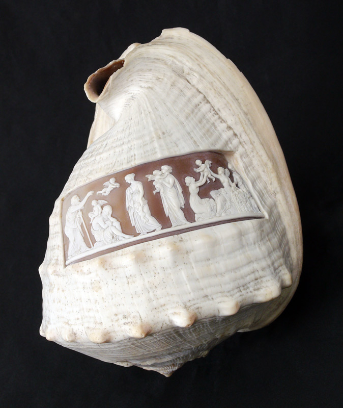 CARVED CAMEO CONCH SHELL: Neo-Classical motif cameo carved panel, overall measures 5 1/2'' h. x 7 1/2'' x 6''.