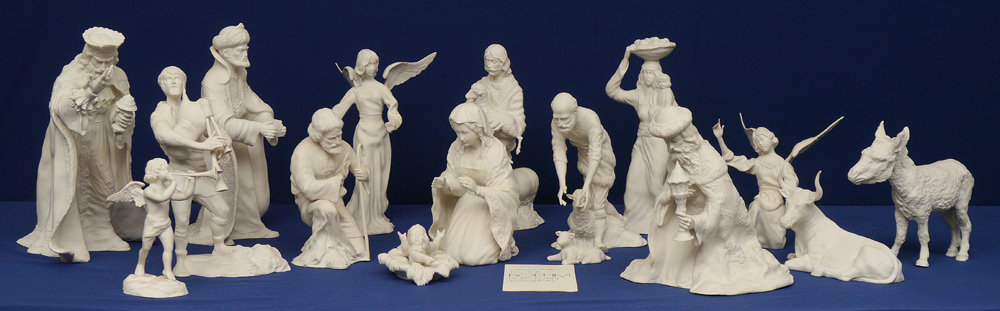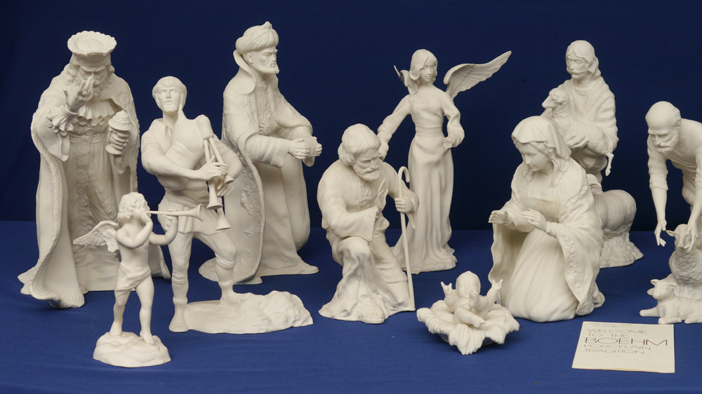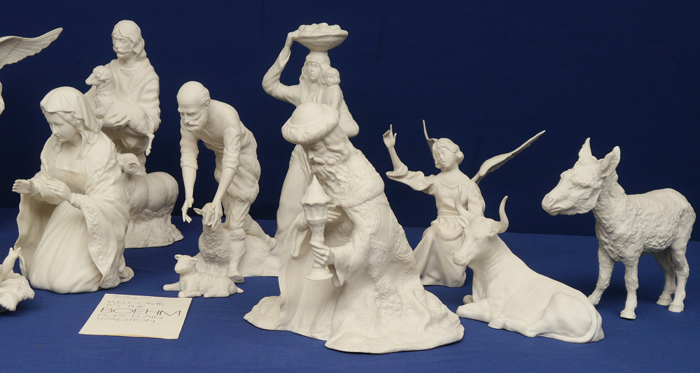 BOEHM PORCELAIN NATIVITY SET: 16 piece set to include; Mary, Baby Jesus & Joseph; The Three Kings; 3 Angels; Shepherds, animals and townsfolk. ''Christian Era Collection, Spirit of Bethlehem'', circa last quarter of 20th century. Tallest figure approx. 12''.