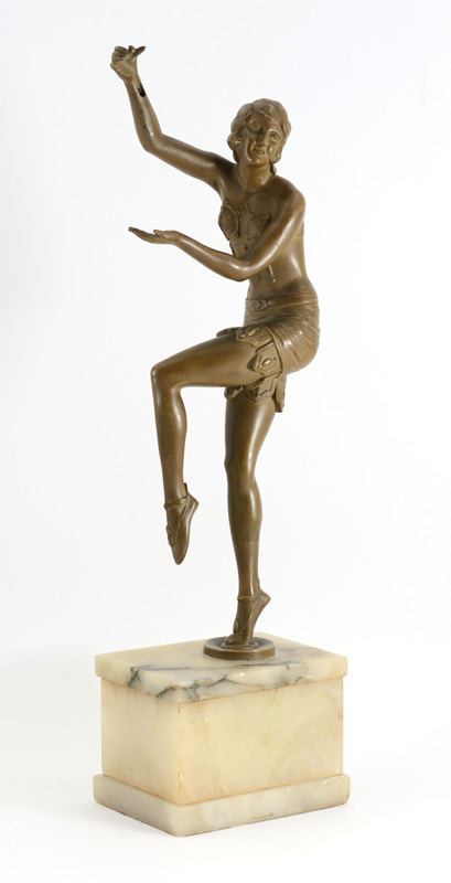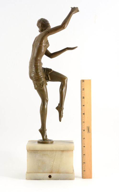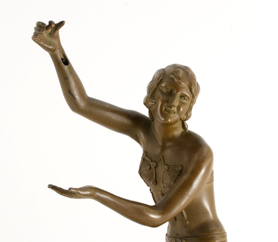 ART DECO ERA FLAPPER GIRL LAMP: Ca 1915-1920, Patinated metal sculpture of an Art Deco Era Flapper Girl mounted on marble plinth, 21''h overall.