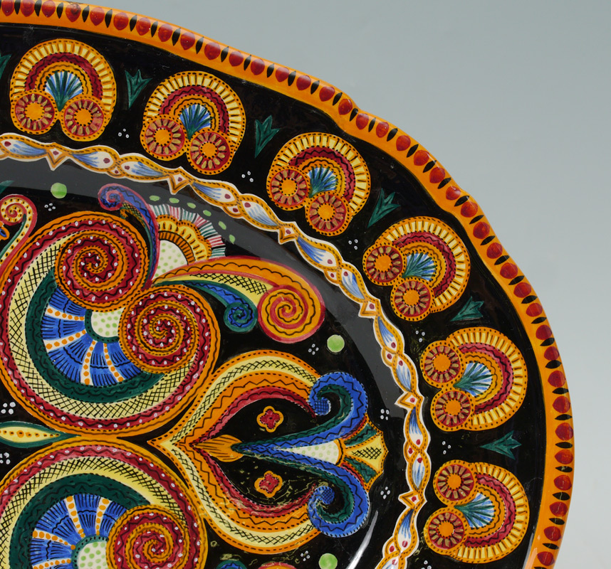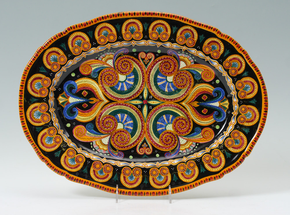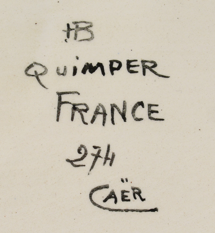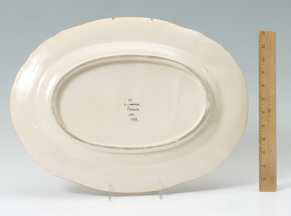 CAER QUIMPER BLACK GROUND PLATTER: Hand painted French faience on black ground, signed Caer, measures 18''.