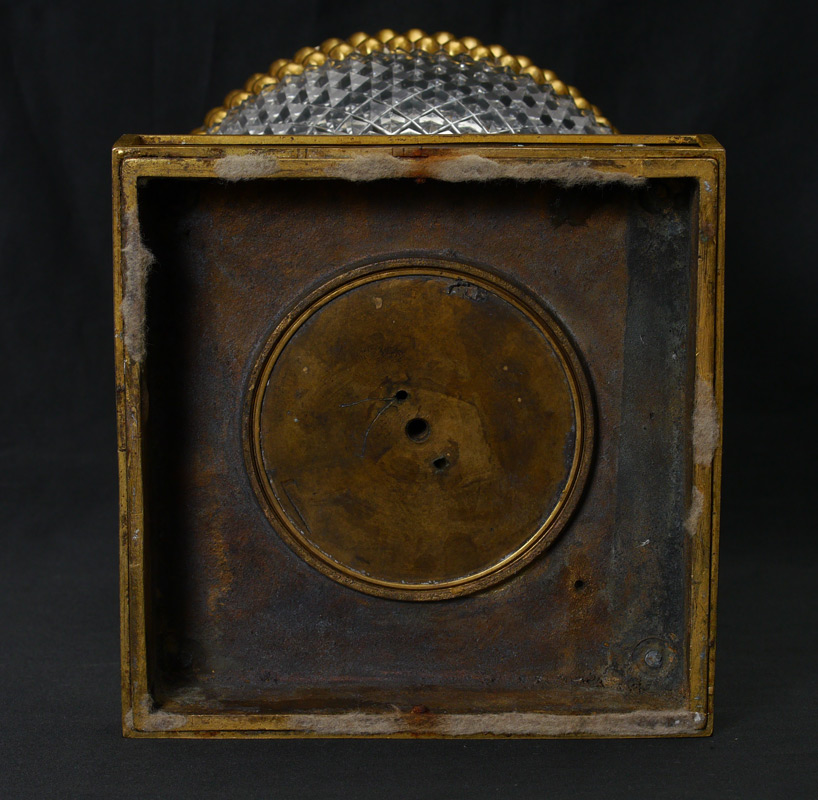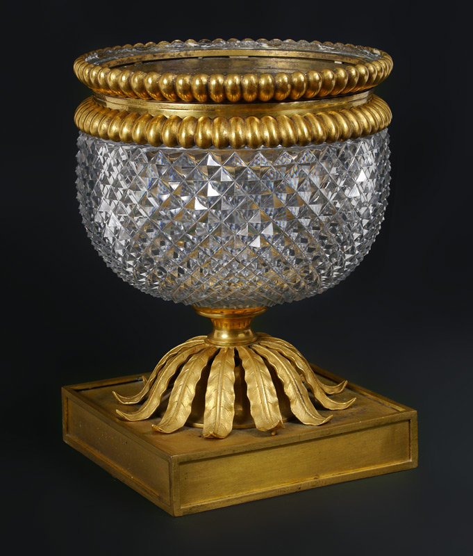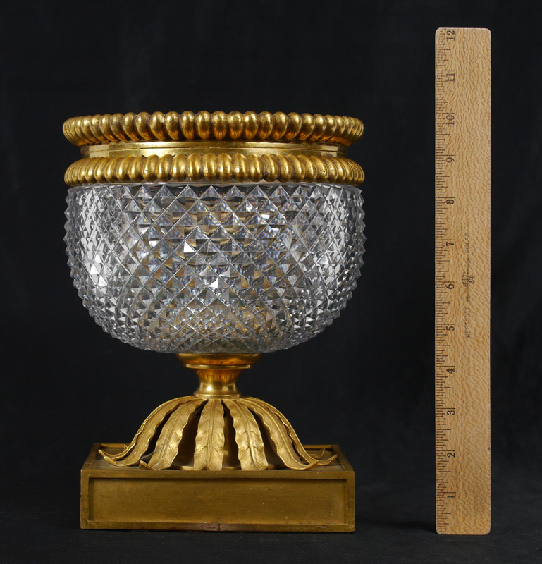 BACCARAT QUALITY DORE BRONZE & CUT GLASS BOWL: Gadroon bronze dore rim mounted to sharply cut glass center bowl. Dore square base with foliate motif, no visible mark. Overall measures 10'' h. x 8''.