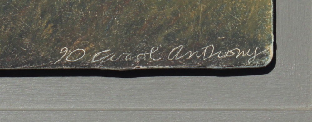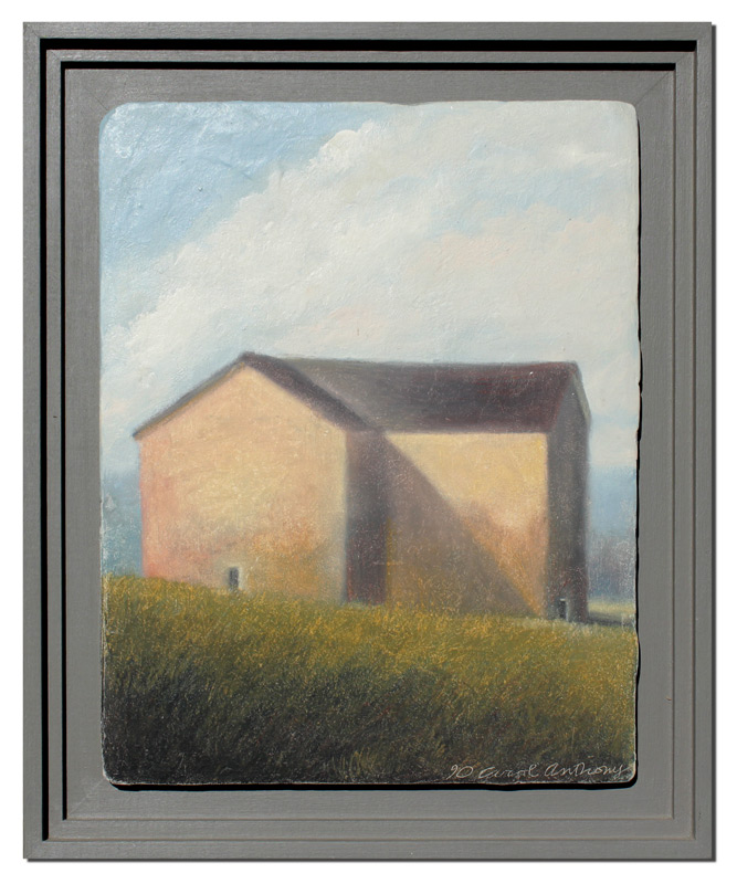ANTHONY, Carol, (American, 1943- ): Misty Barn Landscape, Cray-Pas, 13 3/4'' x 11 1/4'', signed lower right, dated '90, not under glass or plexi, painted frame 17 1/8'' x 14 1/4''.