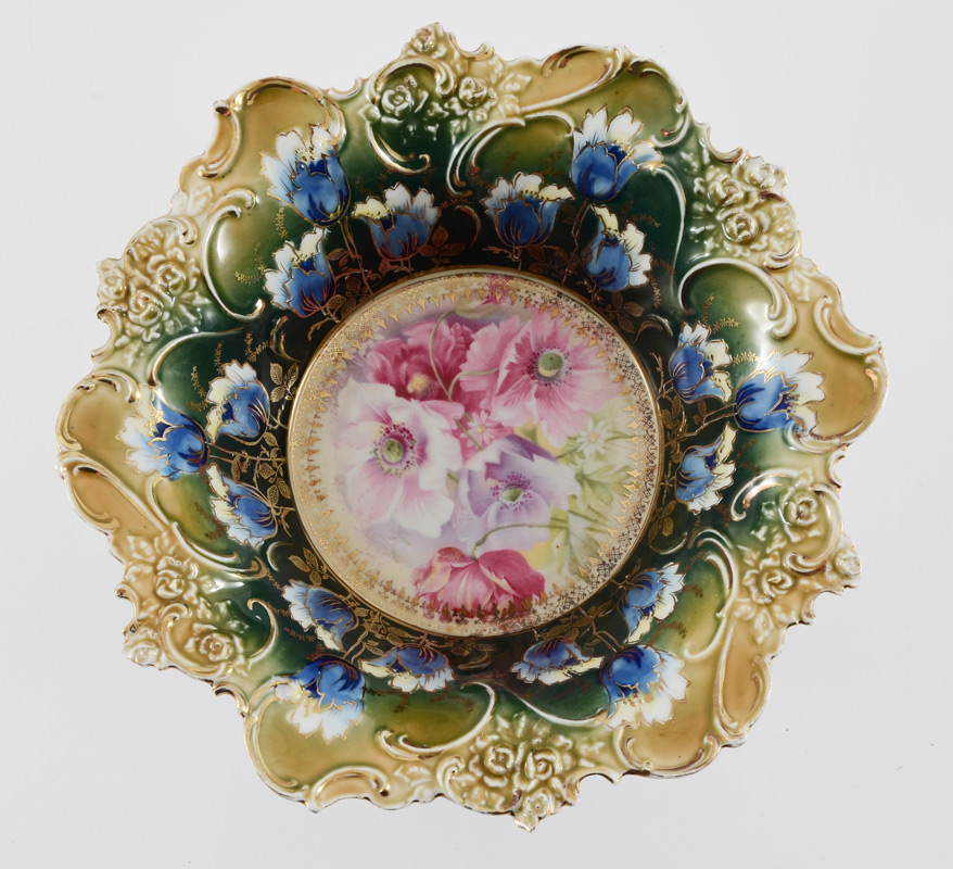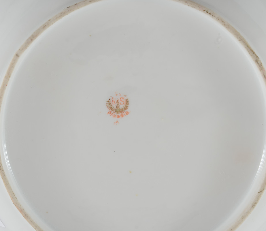 RS PRUSSIA BOWL: Ornate floral mold and decoration. Red wreath mark, 10 1/4'' dia. x 3'' deep.