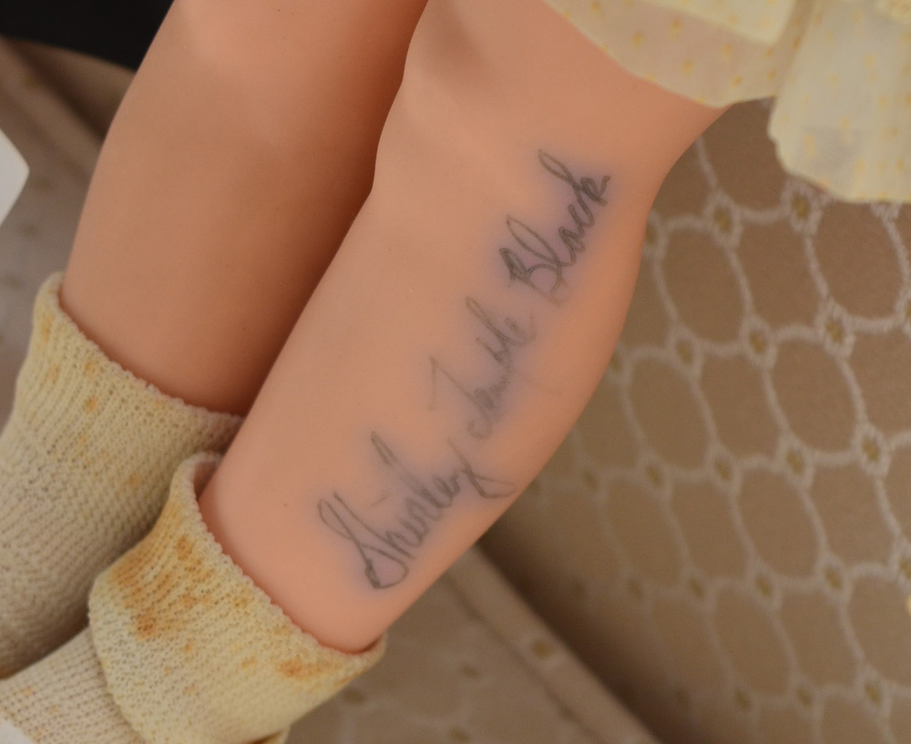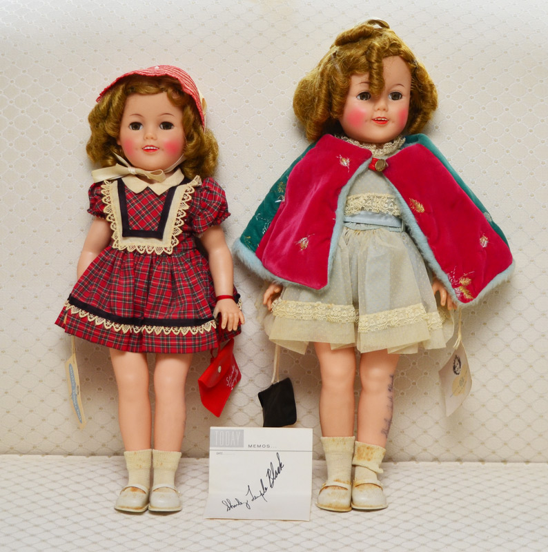 2 IDEAL SHIRLEY TEMPLE DOLLS AUTOGRAPHED: Two all original Ideal soft vinyl dolls with the autograph of Shirley Temple Black on a leg of each. Dressed in original dresses with accessories and Ideal paper tag. Each approx. 17'' tall.
