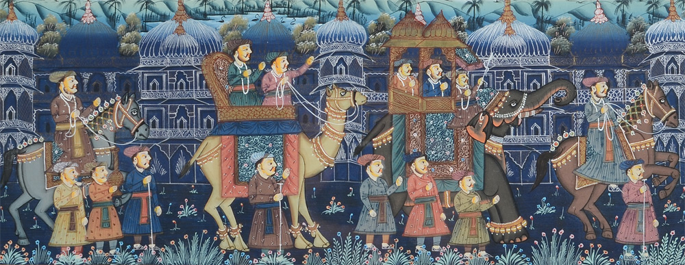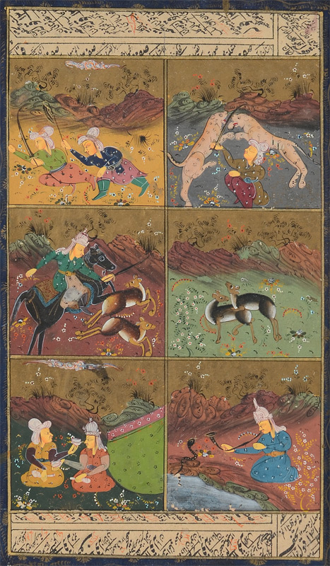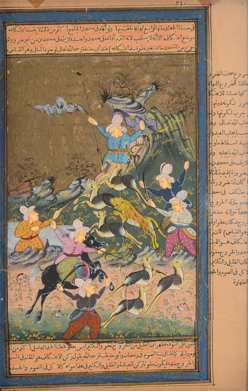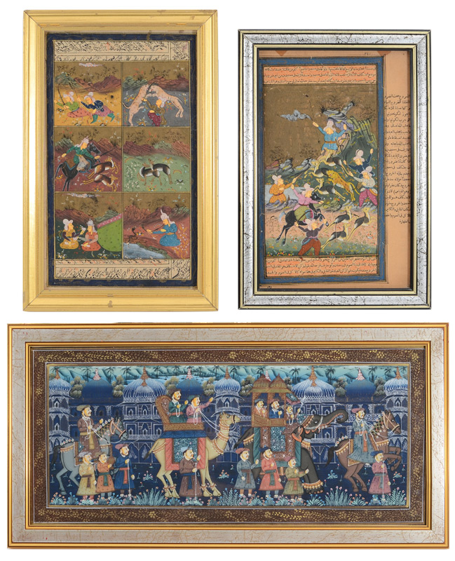 3 PIECE ILLUMINATED PERSIAN PAINTINGS: 2 scenes depict hunting themes, largest frame size is 12 1/2'' x 8'', large scene of royalty, frame size is 9'' x 18''.