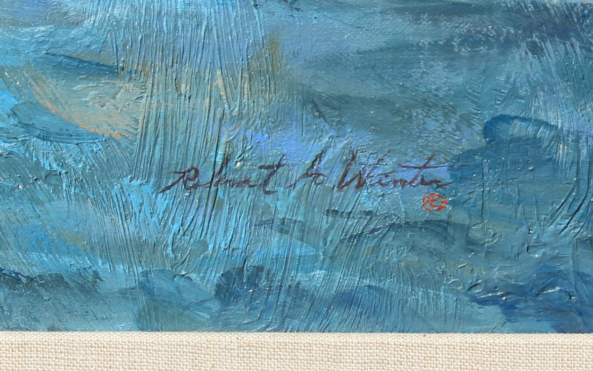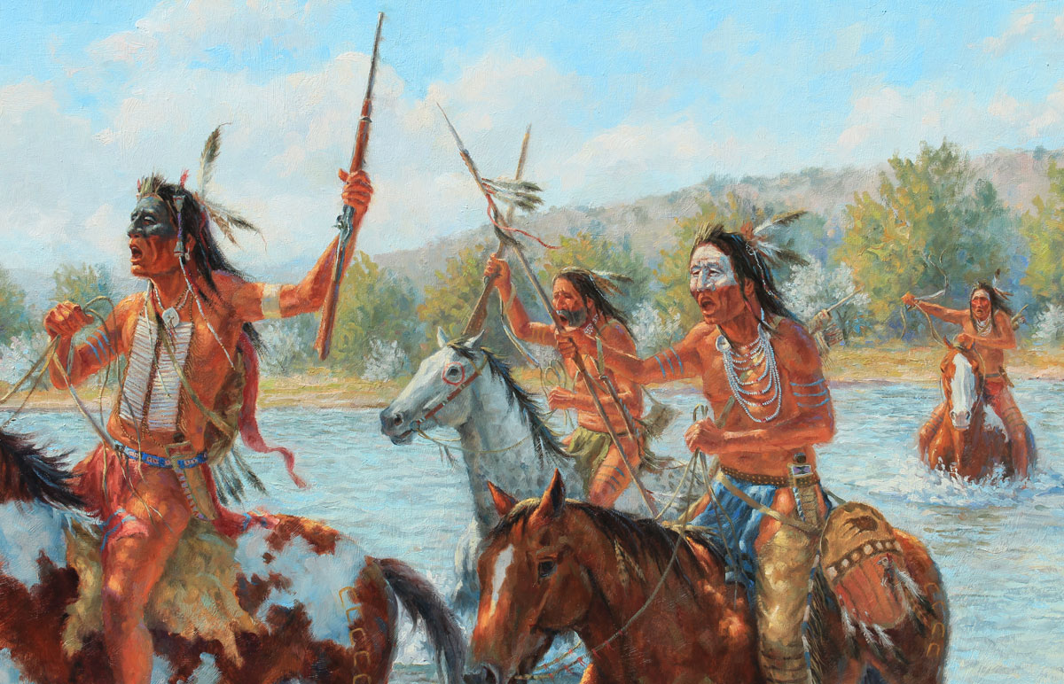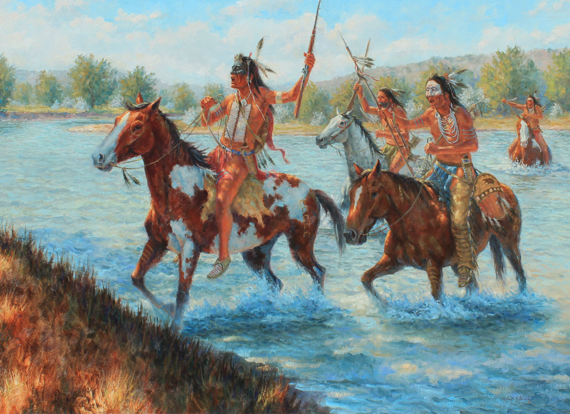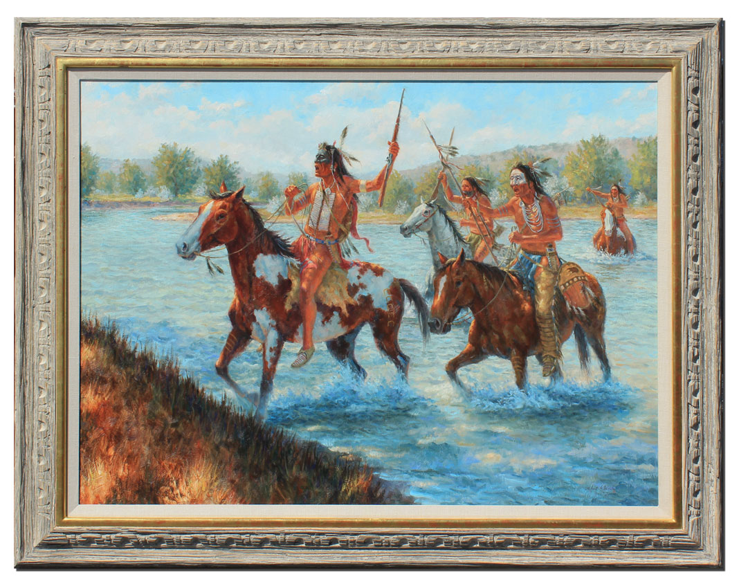 WINTER, Robert, (American, 1953 - ): Indian Braves Crossing a Stream, Oil/Canvas, 36'' x 48'', signed lower right, carved original wooden frame with gilded accents, 46'' x 58''.