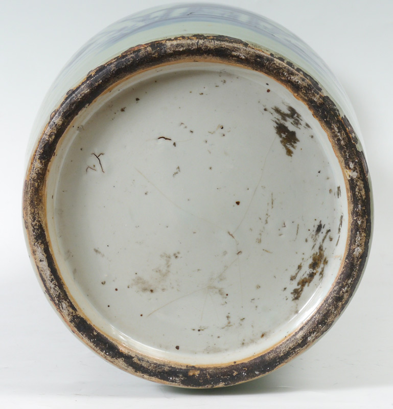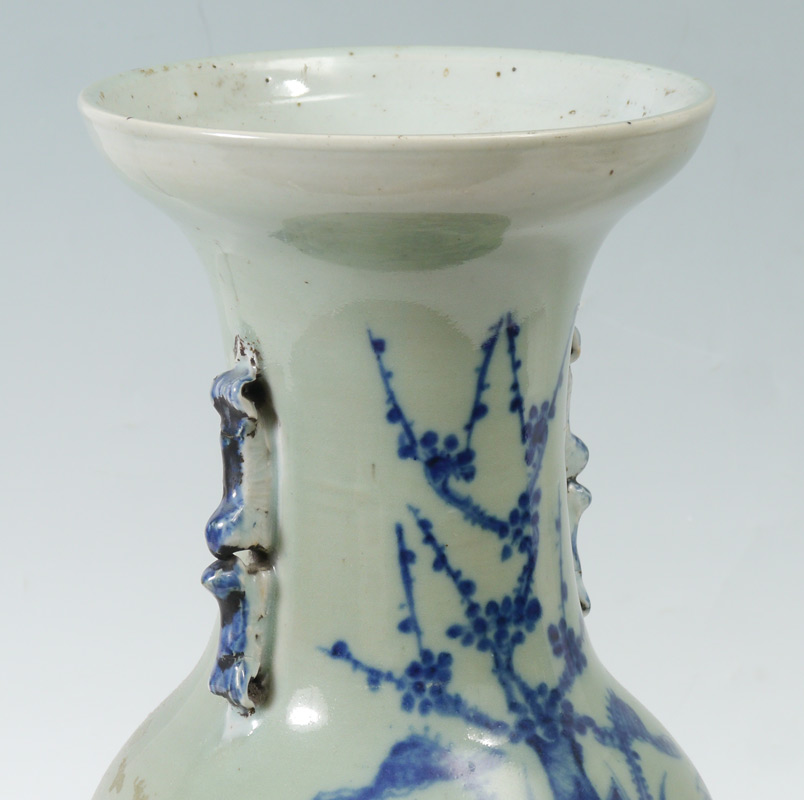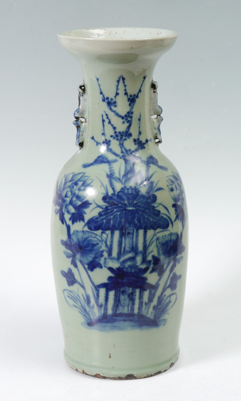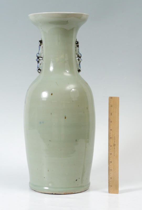 CHINESE LARGE BLUE DECORATED CELADON VASE: Baluster form with applied ''handles'' at neck, floral motif blue decorated body. Overall measure 22 1/4'' h. x 9'' dia.