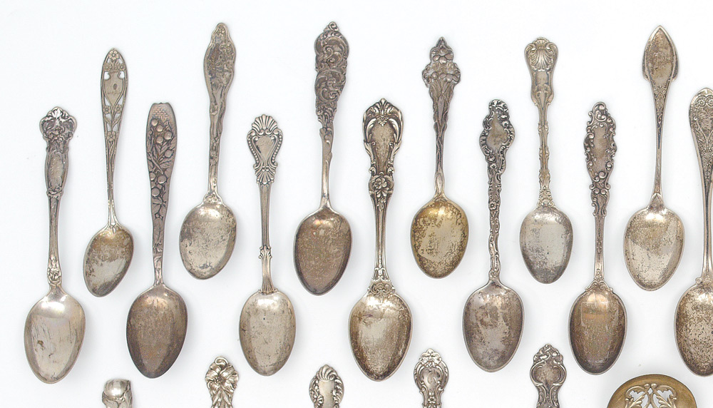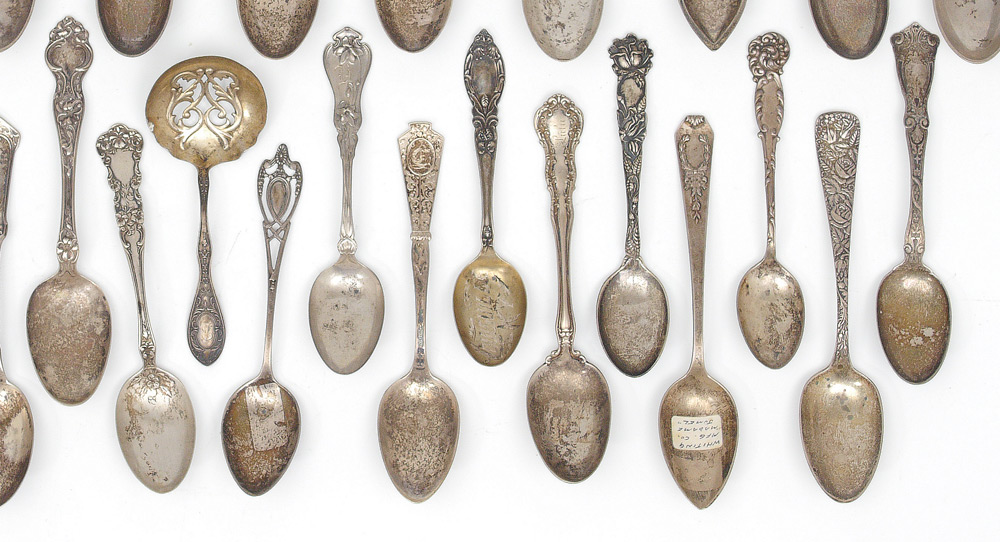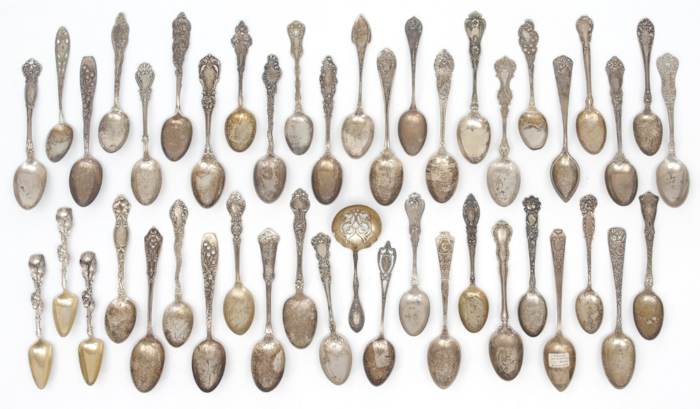 COLLECTION OF 44 STERLING SPOONS: An assembled collection of teaspoons and one bon bon spoon by assorted makers and patterns. Approx. 30.5 troy oz.