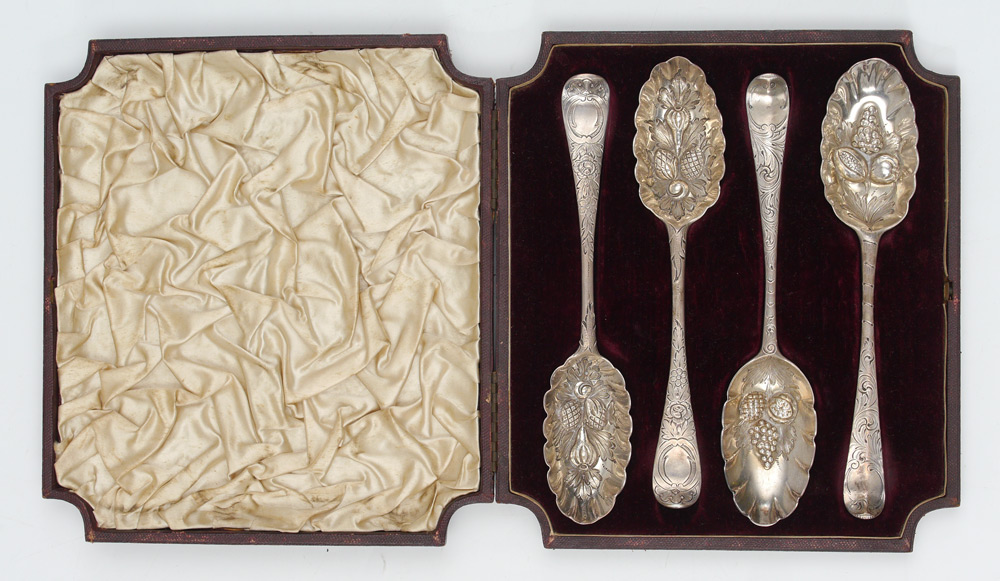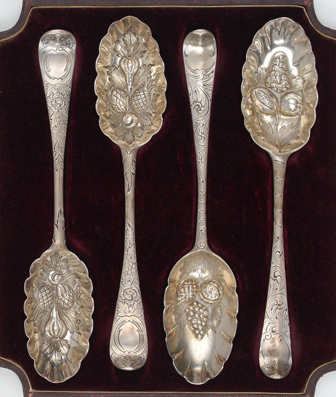 4 ENGLISH BERRY SPOONS IN PRESENTATION BOX: 4 spoons of the George II period to include 1-2) 1737 & 1738 London, unknown maker IW mark, 7 3/4''. 3-4) 2 1735 London, unknown maker IH or HI, 7 3/4''. Sold in a velvet lined presentation box, 9 1/4'' x 8 1/4''. Approx. 6.9 troy oz.