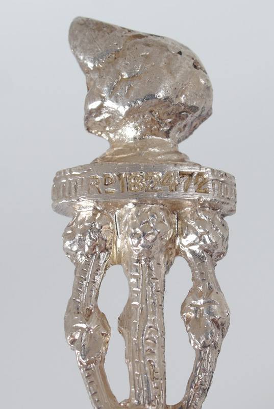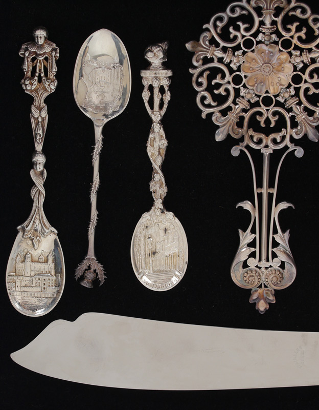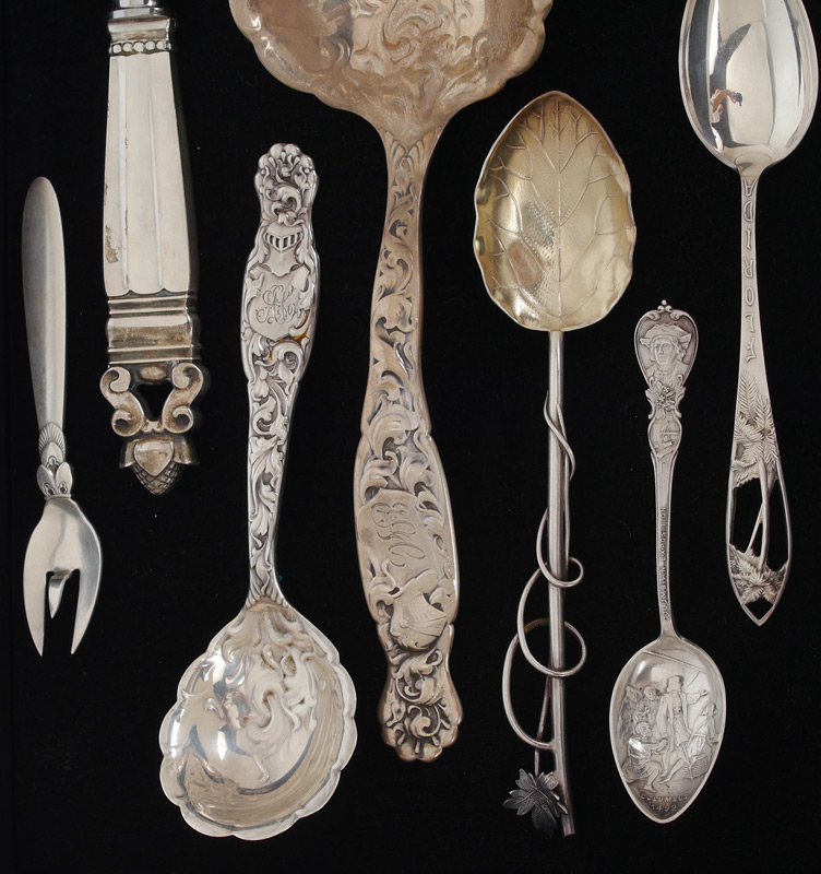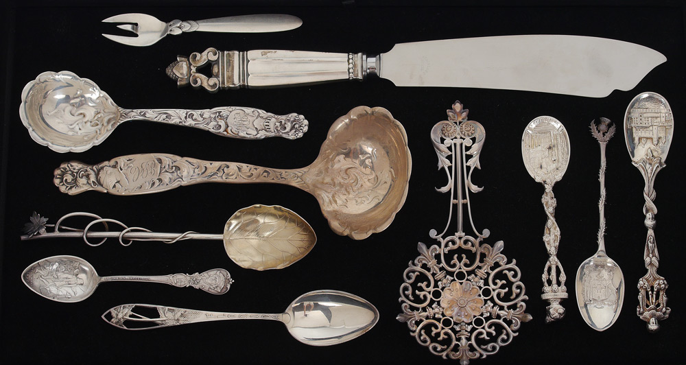 11 PIECE STERLING FLATWARE COLLECTION: An assembled 10 piece collection to include 1-2) Whiting Heraldic pattern cream ladle (7 1/2'') and sugar scoop (5 7/8''), monogrammed. 3) Georg Jensen Acorn pattern cake knife (10 1/2''). 4) Georg Jensen Cactus pattern lemon fork, (4 1/4''). 5) Shiebler reticulated bowl bon-bon spoon, (5 5/8''). 6) Ludwig, Redlich & Co. leaf form spoon. 7-11) 5 assorted souvenir spoons, Florida spoon 5 5/8''. Approx. 9.3 troy oz.