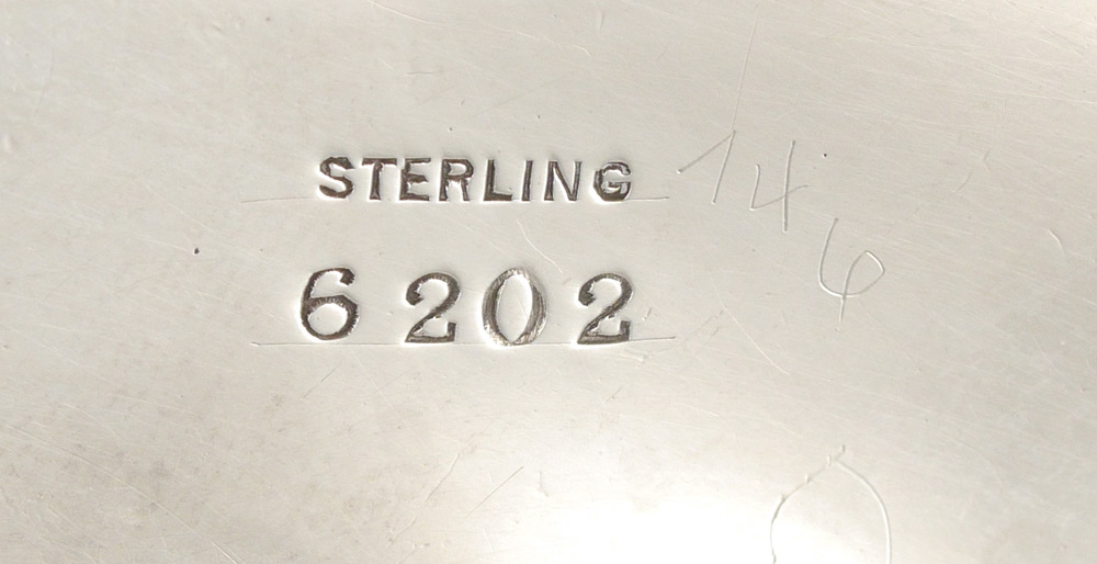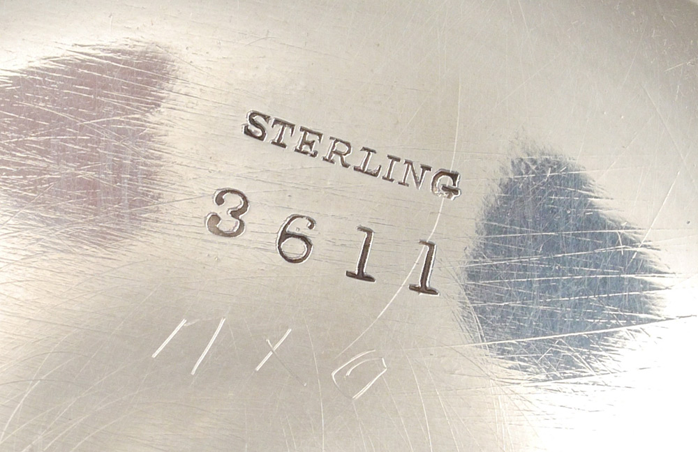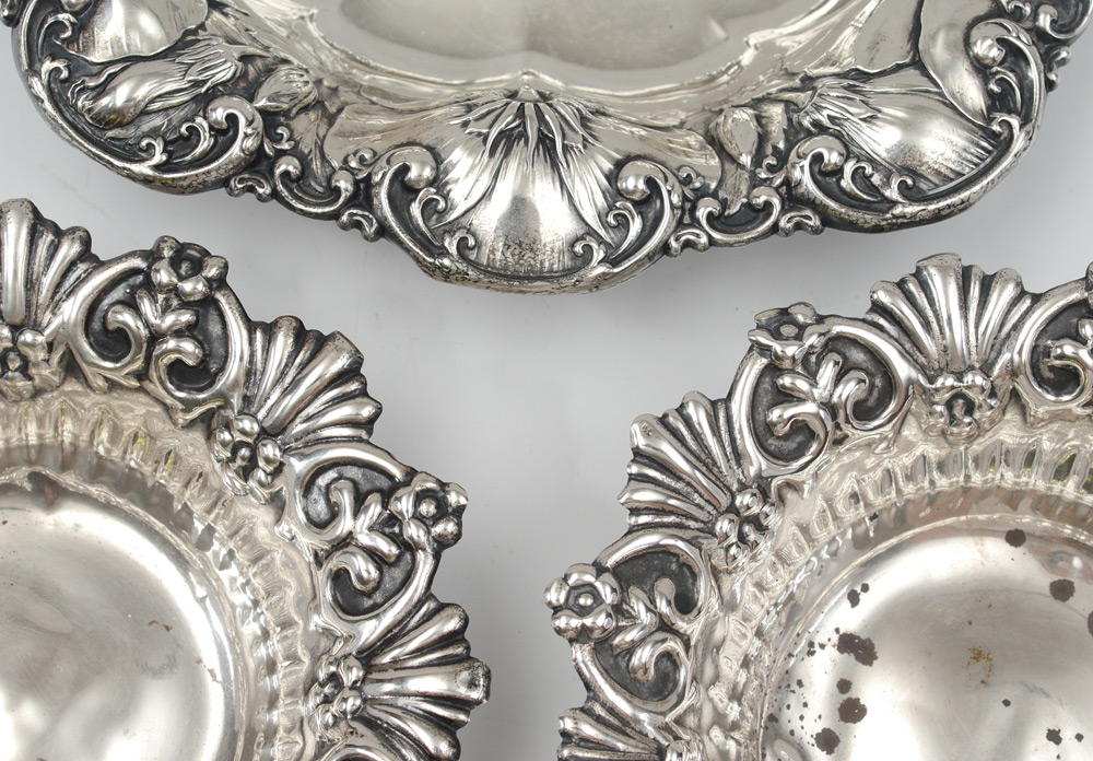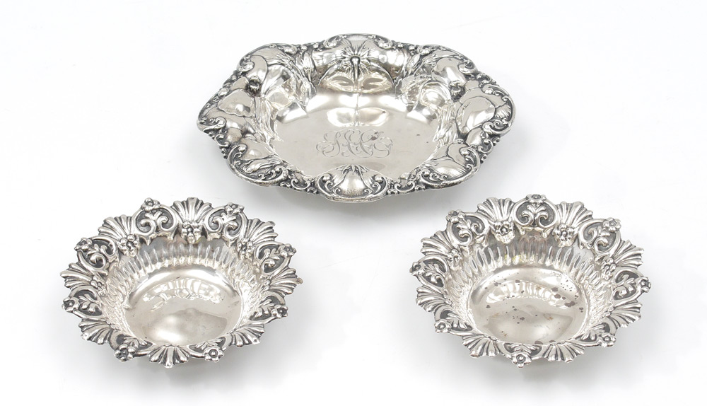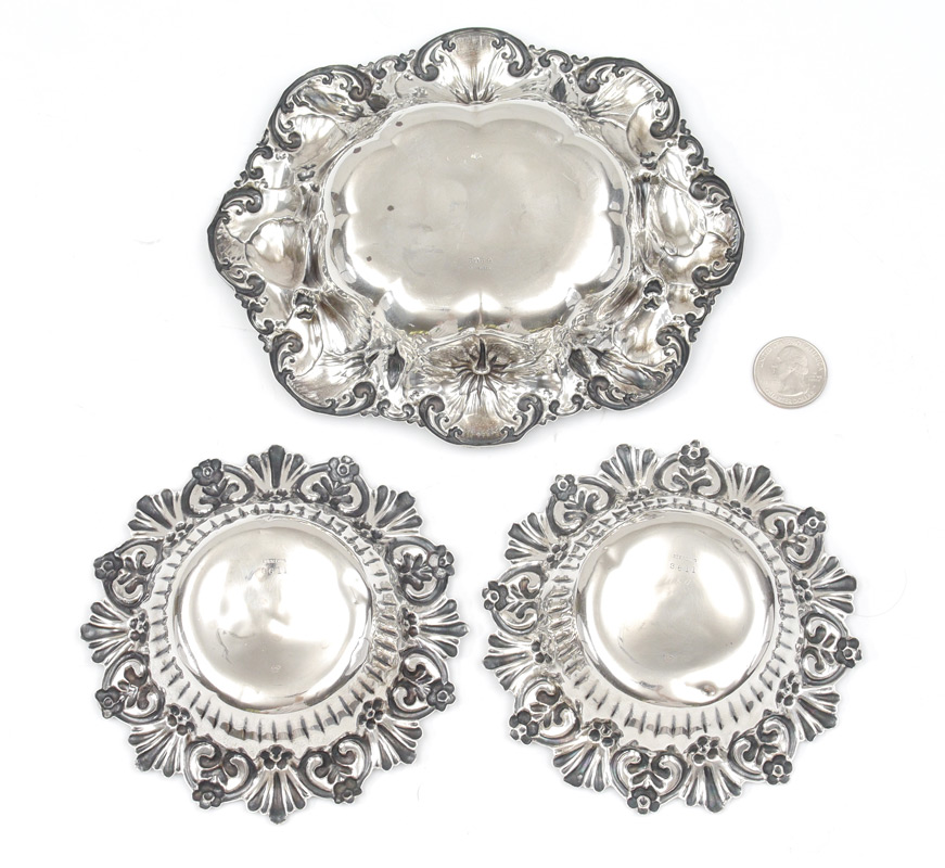 3 WHITING REPOUSSE STERLING NUT DISHES: 3 pieces total by Whiting Silversmiths to include 1) #3202, oval with floral rim, monogrammed center, 1 1/4'' h. x 7'' x 5 3/8''. 2-3) Pair #3611, round with foliate rim, 1 1/4'' h. x 4 3/4'' dia. Approx. 6.4 troy oz.
