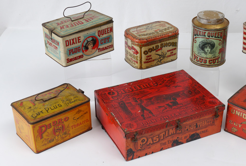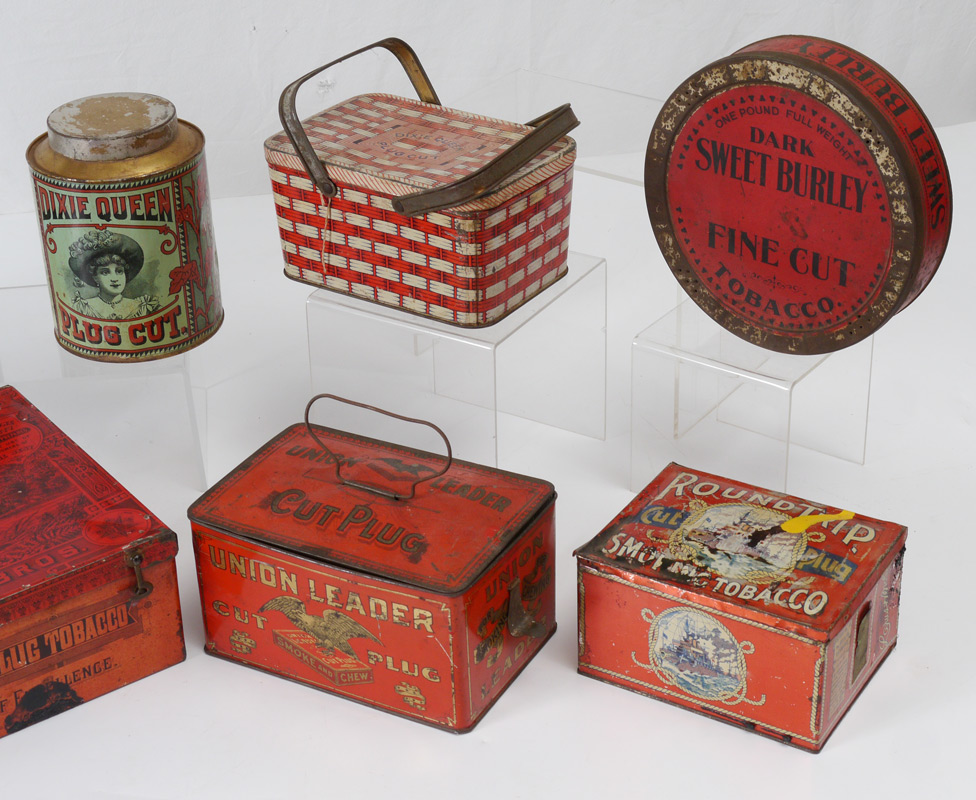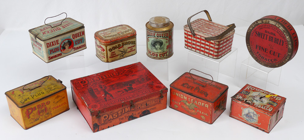 9 PIECE TOBACCO ADVERTISING TINS: 9 pieces total to include 1) Pastime Plug, red box, hinged lid with hook closures, 4'' x 12 1/4'' x 9 1/2''. 2) Dark Sweet Burley, Spaulding & Merrick, 2'' h. x 8 1/4'' dia. 3) Dixie Queen Plug Cut lunch box, 4'' x 8'' x 5 3/4'' 4) Dixie Queen Plug Cut lunch pail, 5'' h. x 8'' x 5 1/2''. 5) Dixie Queen round, 6 1/2'' h. x 5''. 6) Union Leader Cut Plug lunch pail, 4 1/2'' h. x 7 3/4'' x 5 1/2''. 7) Pedro Cut Plug lunch pail, 4 3/4'' h, x 8'' x 5 1/2''. 8) Round Top Cut Plug box, 3 3/4'' x 7'' x 5''. 9) Gold Shore Cut Plug box, 4 1/2'' x 7'' x 4 3/4''.