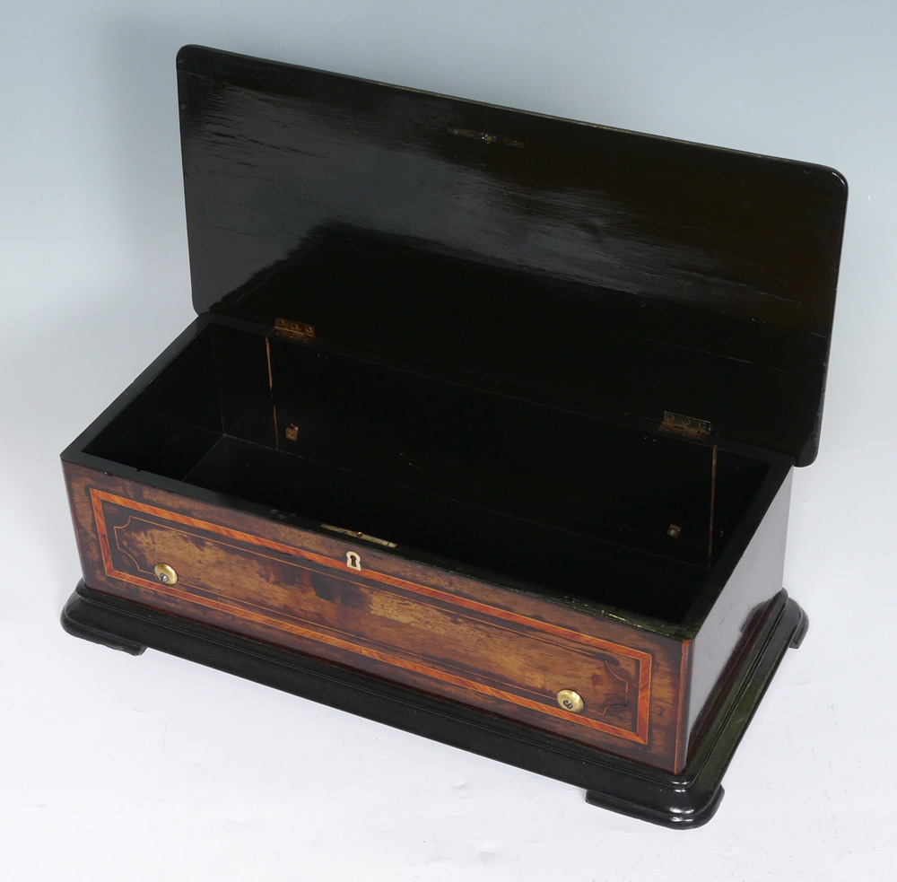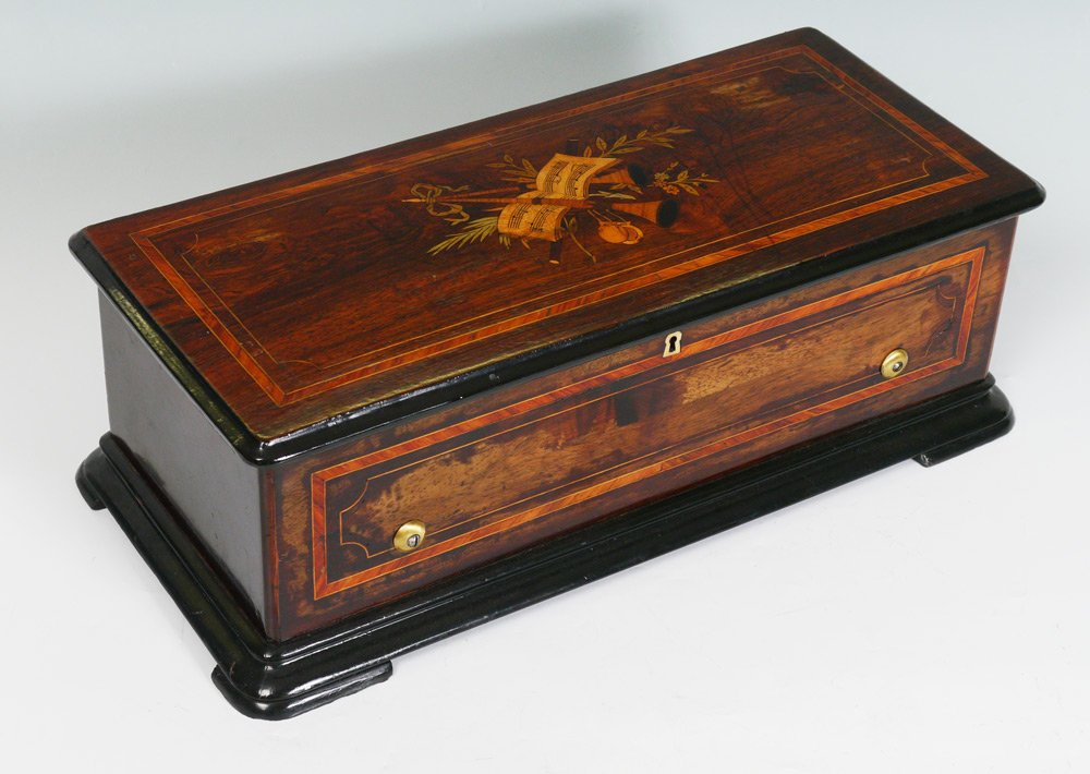 SWISS CYLINDER ROLL MUSIC BOX CASE: Case only, with inlaid musical instruments and sheet music on hinged lid, string inlay on lid and sides. 8'' h. x 24 1/2'' x 11''.
