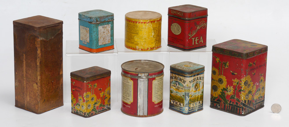 8 PIECE TEA ADVERTISNG TINS: 8 pieces total to include 1) Wm. George & Sons Indo Tea, 8 3/8'' x3 1/2'' x 3 1/2''. 2) Teltey's Tea, 6'' h. 3) Tetley's Tea, 4''. 4) Japan Tea, 4 1/4''. 5) Maxwell House Tea, 3 1/2''. 6) Golden Wedding Tea, 3 7/8''. 7) Monarch Tea, 4 1/2''. 8) American Desert Tea, 3 1/4''.