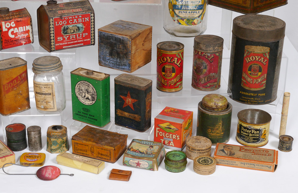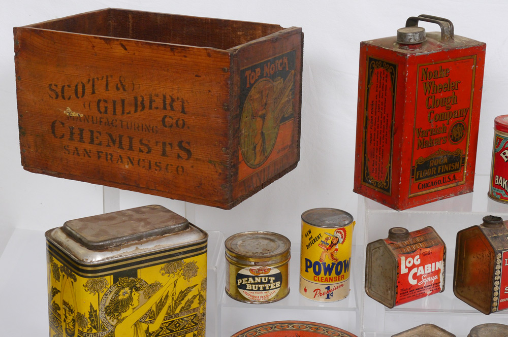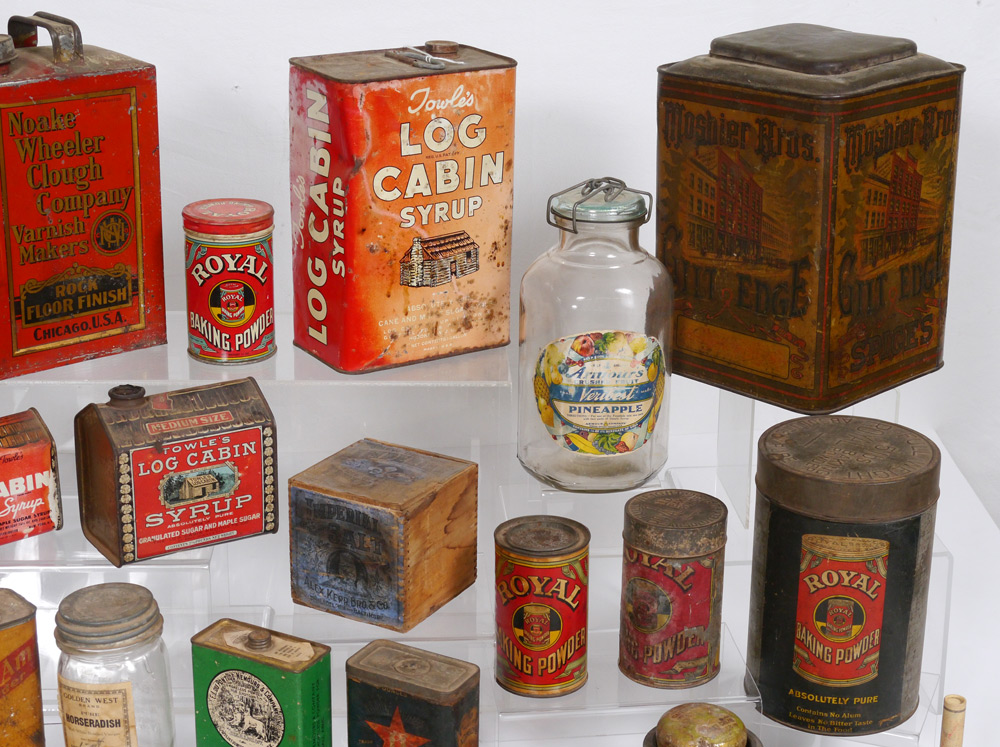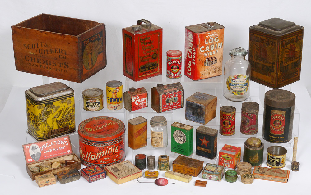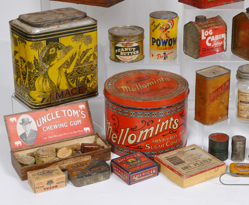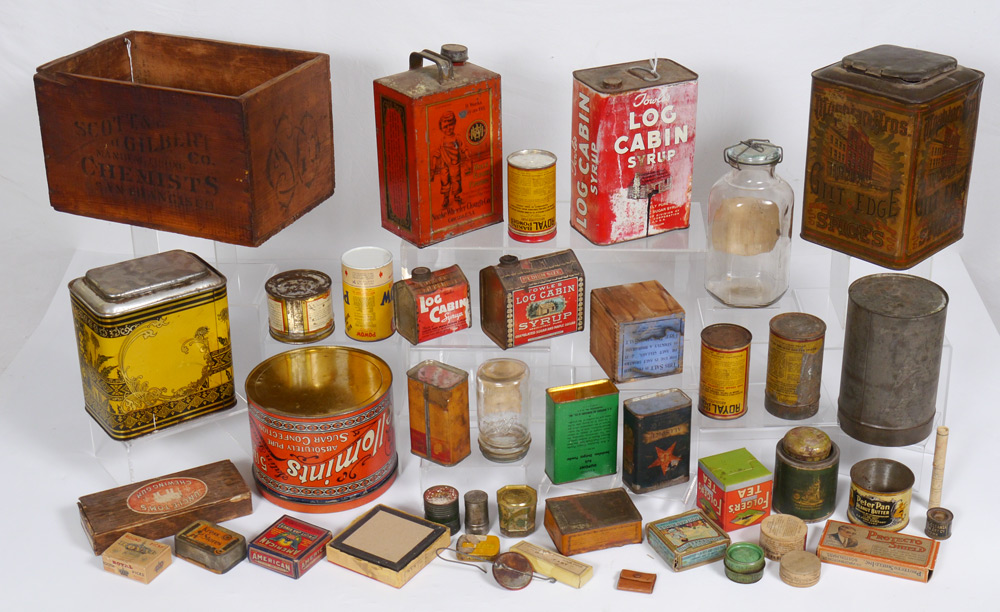 46 PIECE ASSORTED ADVERTISING TINS: An assembled collection of approx. 46 tins, bottles, boxes. Highlights include Top Notch Vanilla wood box (9'' h. x 14 1/2'' x 9 1/2''), Moshier Brothers Gilt Edge Spices, 11'' h., multiple Log Cabin Syrup including one unopened, Peter Pan peanut butter, Mellomints and much more. Not all food related with some powders, eyeglass inserts, and other household items.