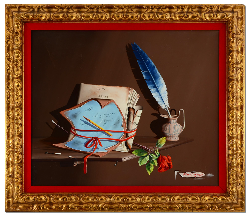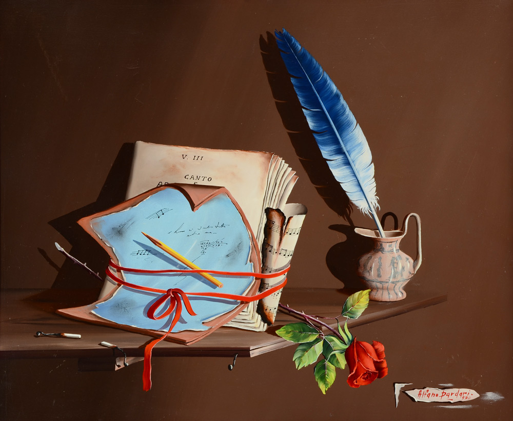 DARDARI, Alfano, (Italian, 1924- ): Trompe l' oeil with Musical Theme, Oil/Canvas, 20'' x 24'', signed lower right, dated 1970, carved and gilded frame 25'' x 29 1/2''.