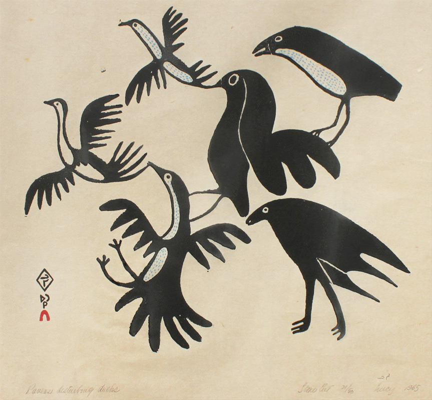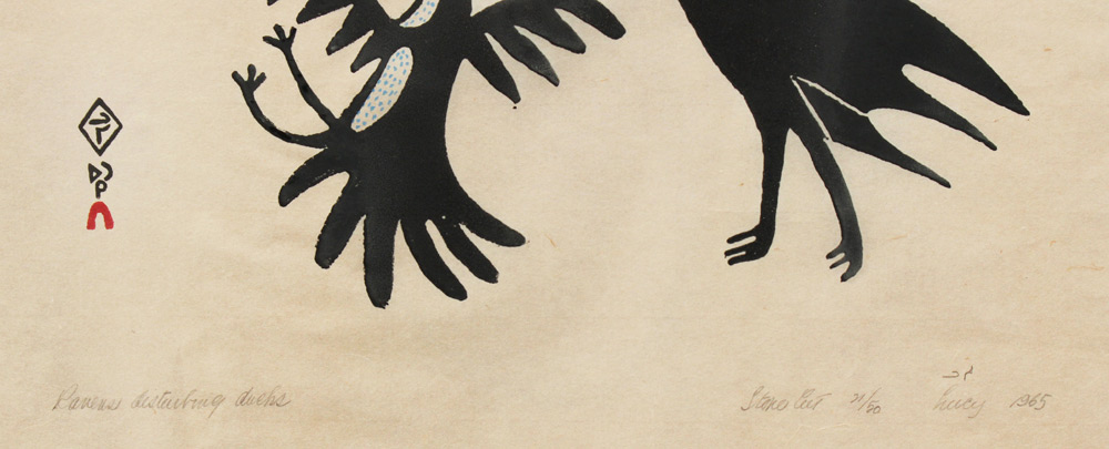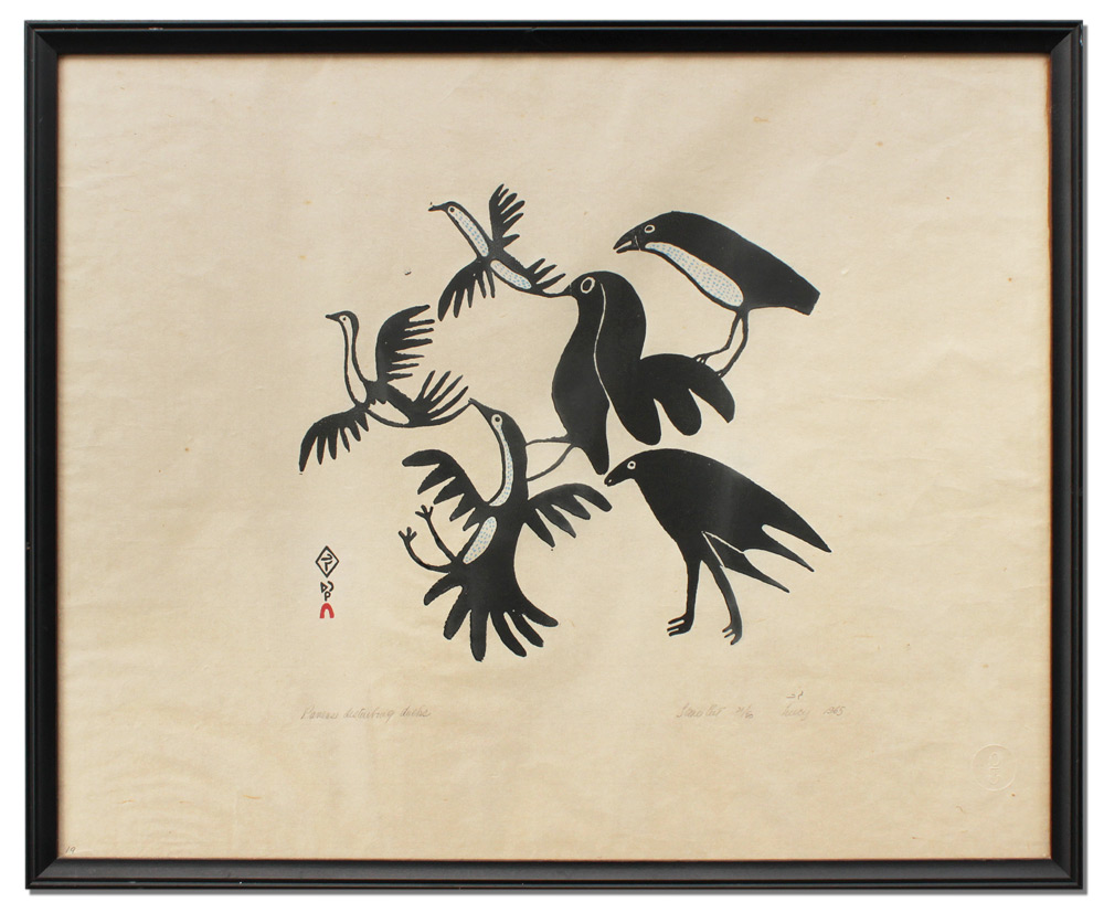 QINNUAYUAK, Lucy, (American, 1915-1982): ''Raven's Disturbing Ducks'', Stone Cut, Sight size 19 1/4 x 24 1/2'', signed lower right, dated 1965, #'d 21/50, titled lower left in pencil, black frame 20 3/4'' x 26''.