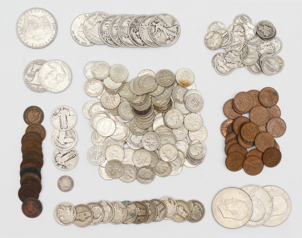 ASSEMBLED COLLECTION OF US SILVER COINS & MORE: Silver coins to include 1885 Morgan dollar, 3 1971-1976 Eisenhower dollars, 6 walking liberty half, 4 Ben Franklin half, 3 standing liberty quarters, 30 Mercury dimes, 118 Roosevelt dimes. Non silver coins include 12 nickels, 13 Indian Head pennies. Ungraded, approx. 16.9 troy oz.