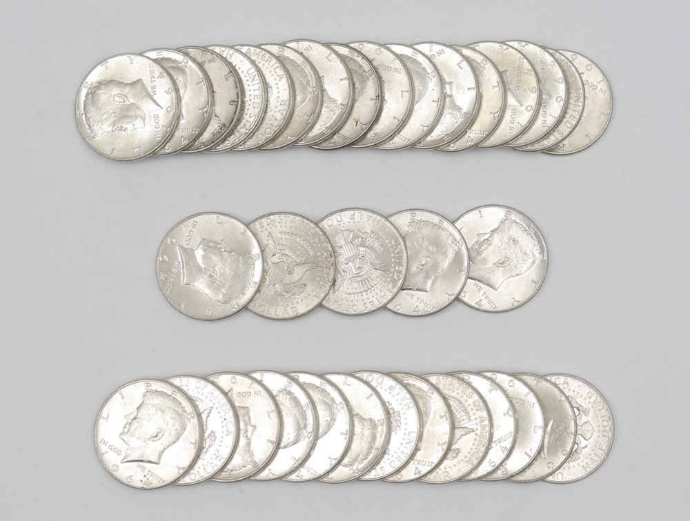 34 SILVER 1964 KENNEDY HALF DOLLARS: Ungraded, approx. 13.6 troy oz.