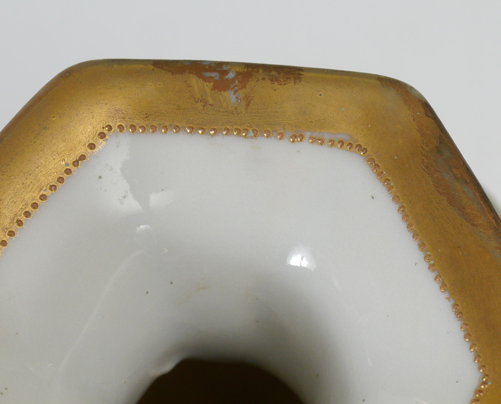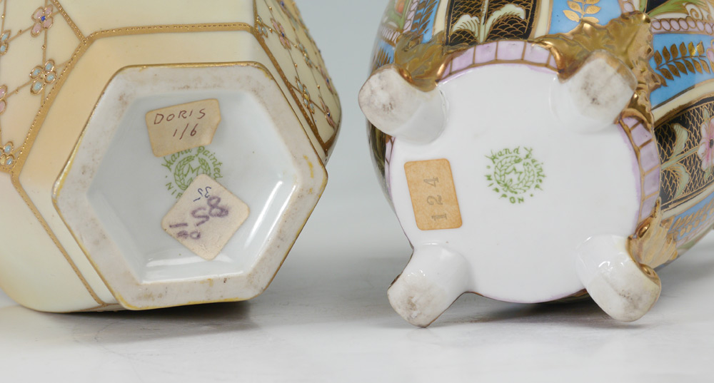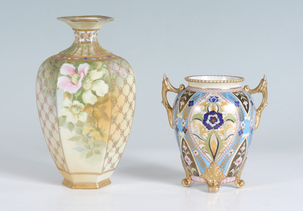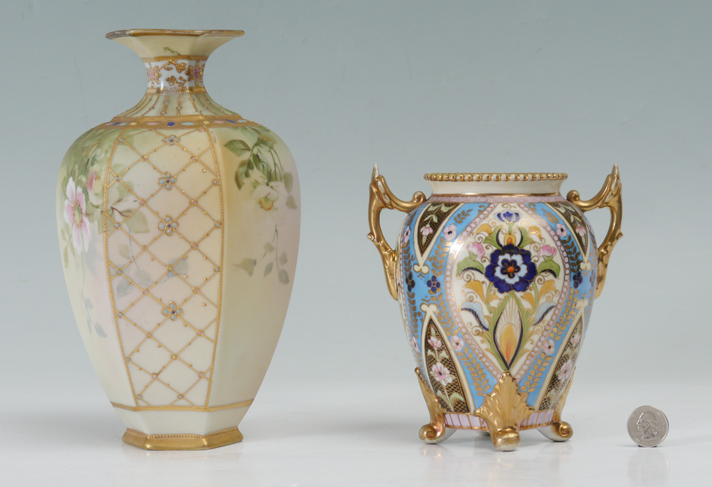 2 PIECE NIPPON FLORAL VASES: 2 piece Morimura Brothers to include 1) Double handled vase with bright floral decoration, on 4 feet, green under glaze mark, 6 1/2'' h. x 6 1/4''. 2) Hexagonal with floral and applied gilt decoration, green under glaze mark. 9 1/2'' h. x 6''.