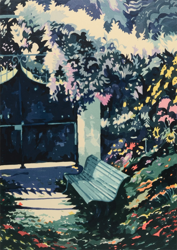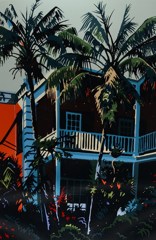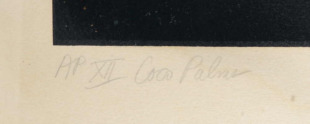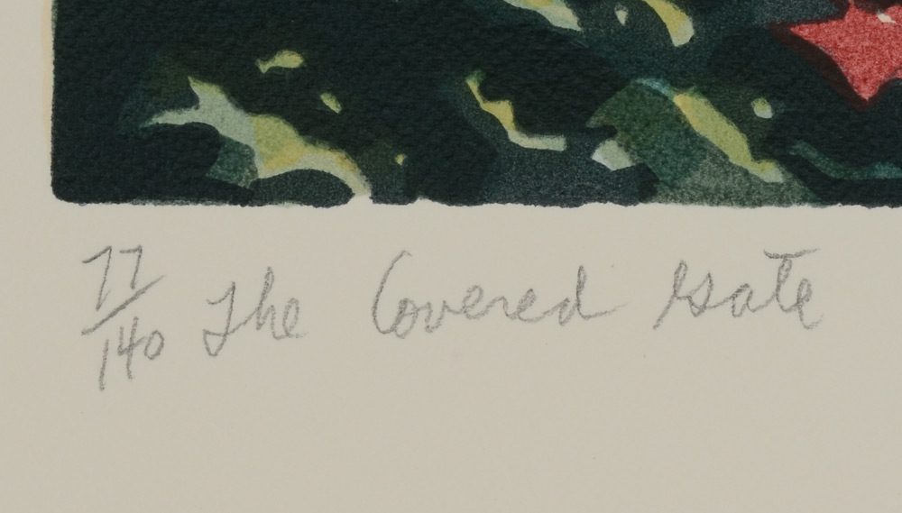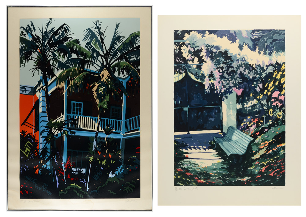 CARSMAN, Jon, (American, 1944-1987): 2 Piece Serigraph lot; 1) ''The Covered Gate'', measures 33 3/4'' x 25 3/4'', pencil signed lower right, #'d 71/140 lower left, titled, unframed; 2) '' Coco Palms'', oval size 34'' x 24 1/4'', pencil signed lower right, marked AP #XII, titled lower left, thin edge chrome frame.