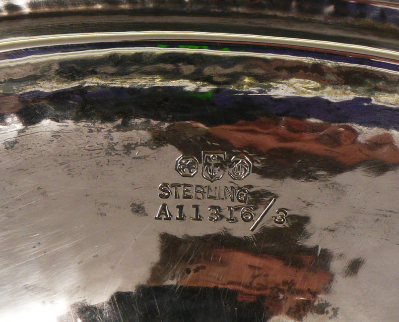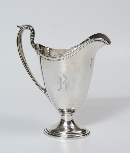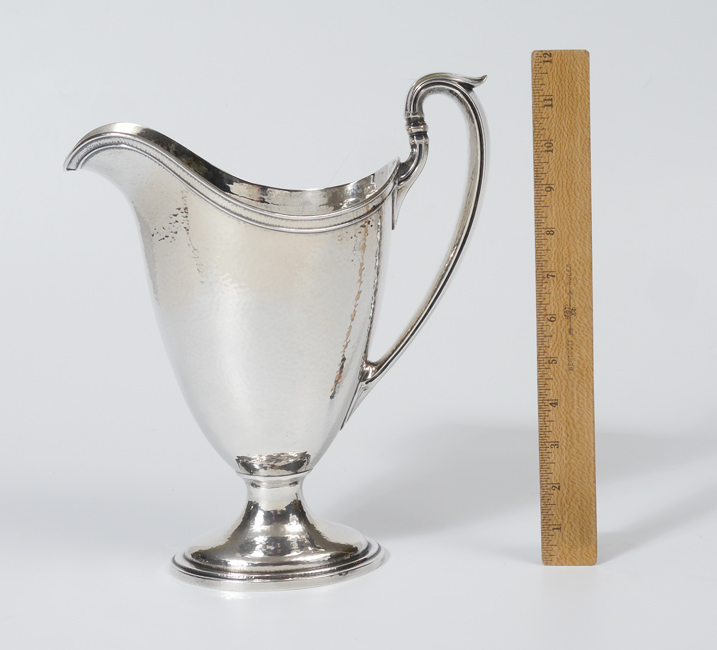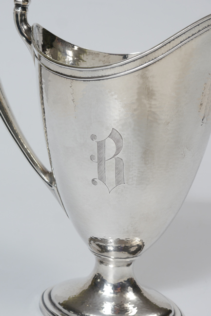 GORHAM HAND HAMMERED STERLING WATER PITCHER: Hand hammered all over, monogrammed ''B''. Marked with Gorham hallmark, Sterling, A11316/3. Measures 11 5/8''h. x 9 3/4''. Approx. 26.0 troy oz.
