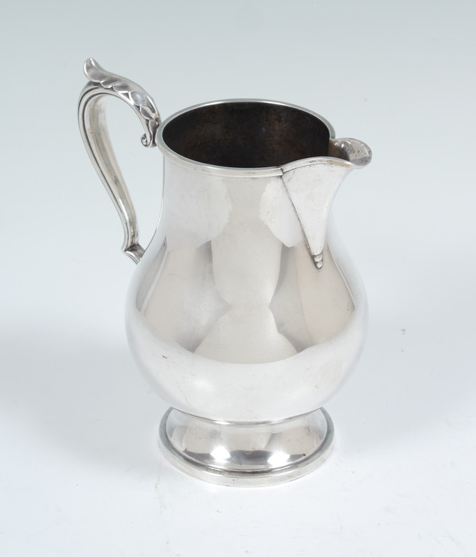 M. FRED HIRSCH STERLING WATER PITCHER: Handle with applied flora decoration, marked on base with M. Fred Hirsch hallmark, Sterling, 442. 9'' h. x 8 1/2'', approx. 22.8 troy oz.