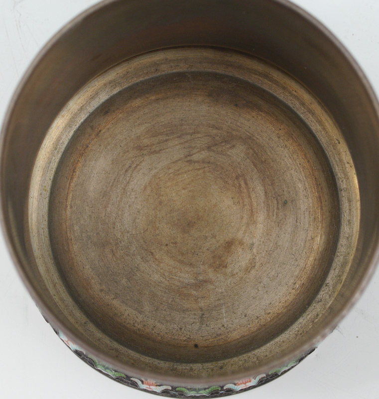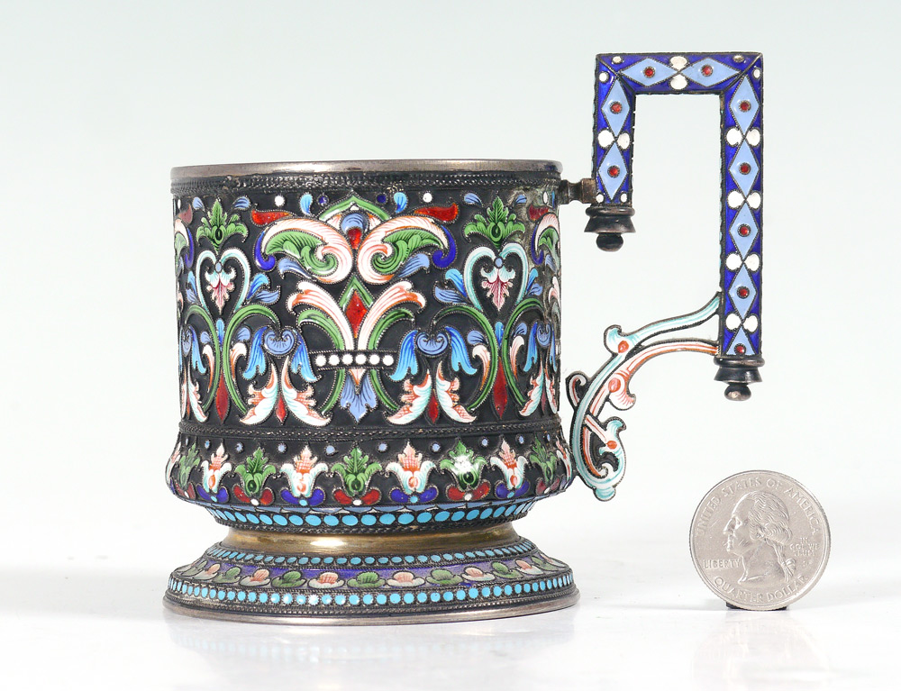 IVAN SALTIKOV RUSSIAN ENAMEL TEA CUP HOLDER: Profusely enameled in foliate motifs, 1882-1899, Moscow 84 zolotnik and Salitkov makers hallmark on base. Overall measures 4'' h. x 4 1/4'', approx. 6.3 troy oz.