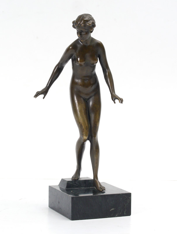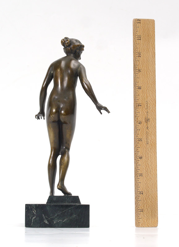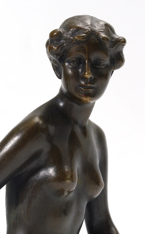 BRONZE NYMPH SCULPTURE: Depicts a Young Female Nude, 10'' h., affixed to a polished marble plinth, 11 1/4'' overall, no visible signature.