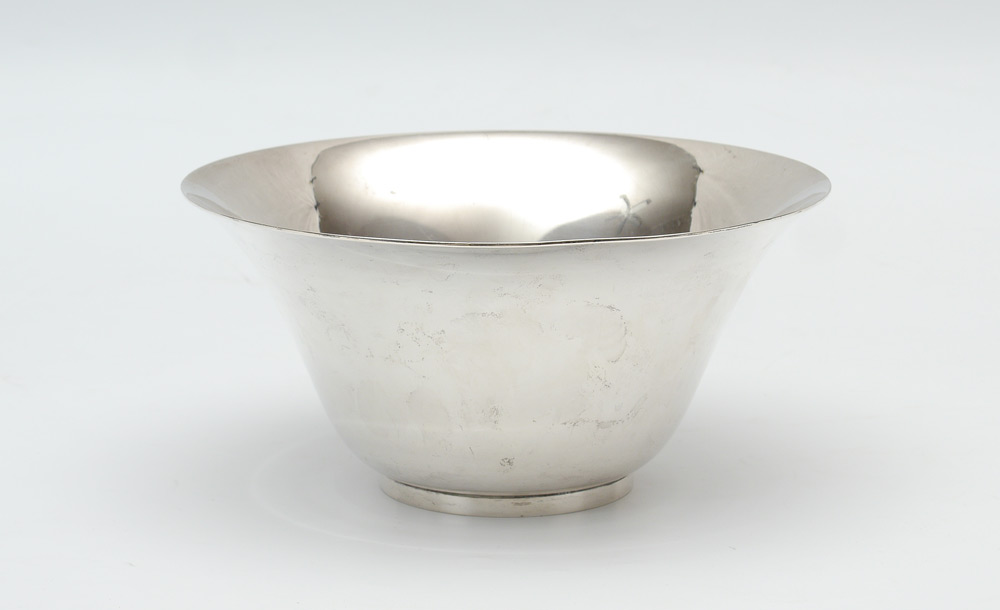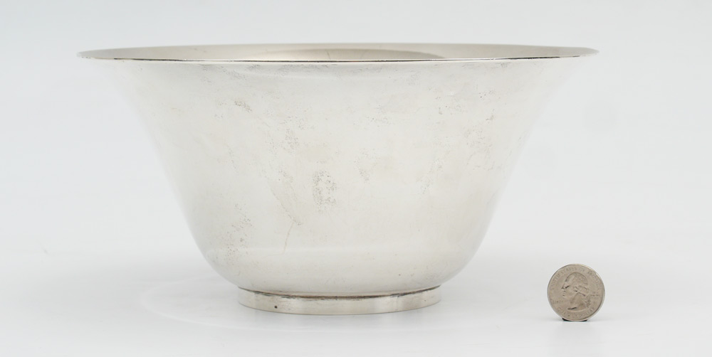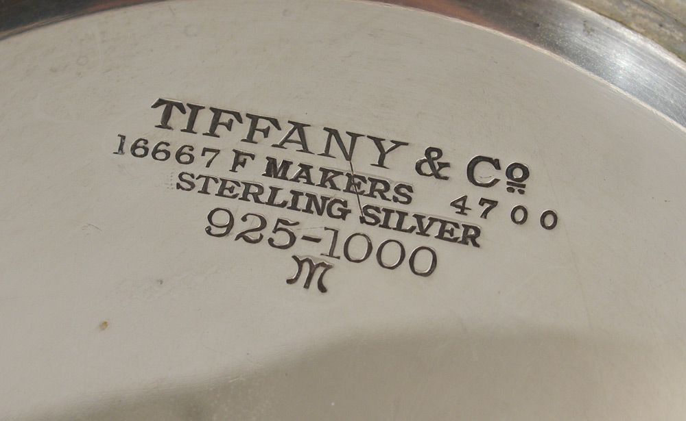 TIFFANY STERLING SILVER CENTER BOWL: Flared rim, marked ''Tiffany & Co., 16667 F Makers 4700, Sterling Silver, 925-1000, M''. 4 3/8'' h. x 9 1/8'' dia., approx. 31.4 troy oz.