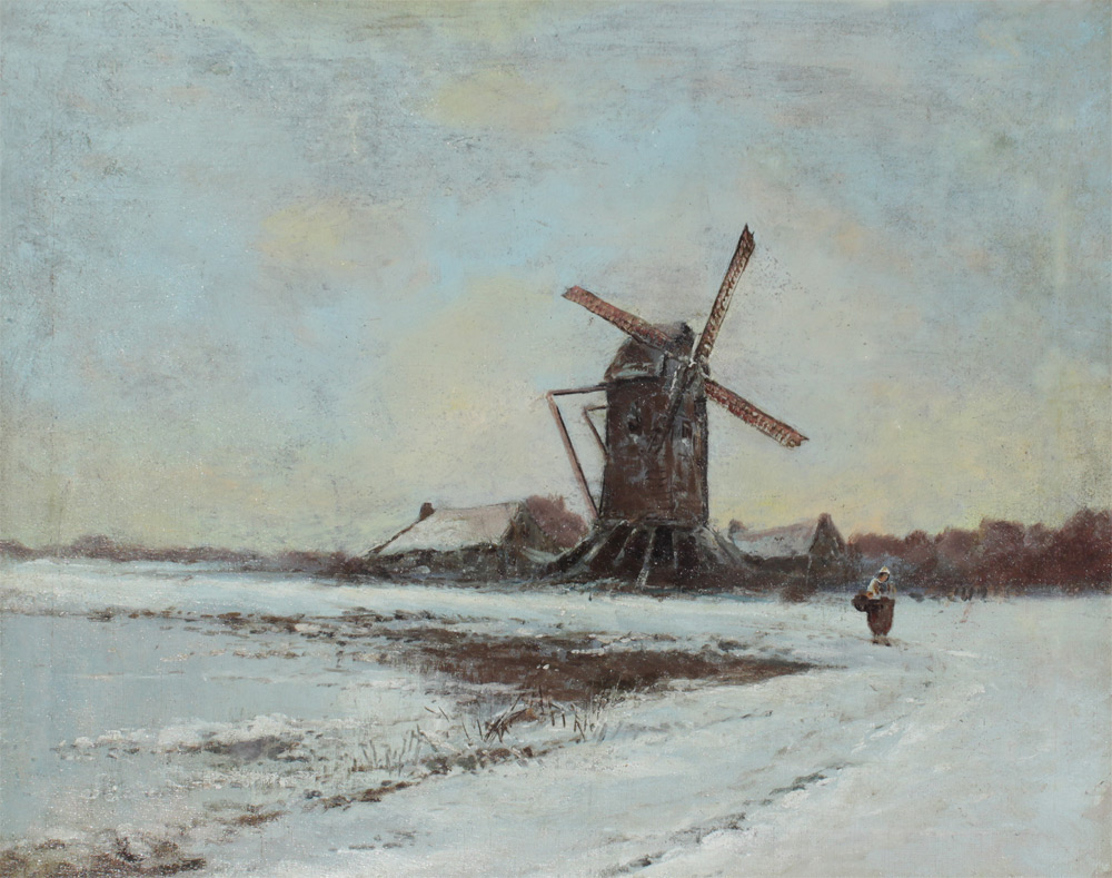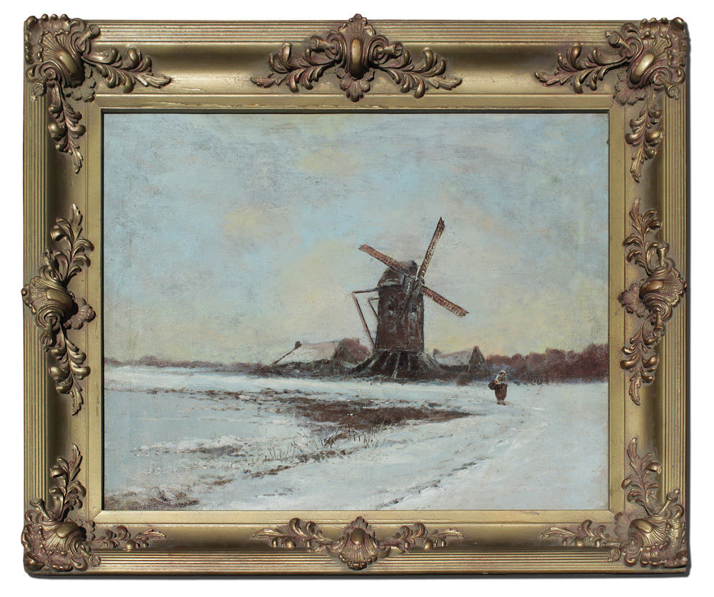 DUTCH WINTER WINDMILL LANDSCAPE PAINTING: Oil/Canvas, 16'' x 20'', faintly signed lower left, framed 21'' x 25''.