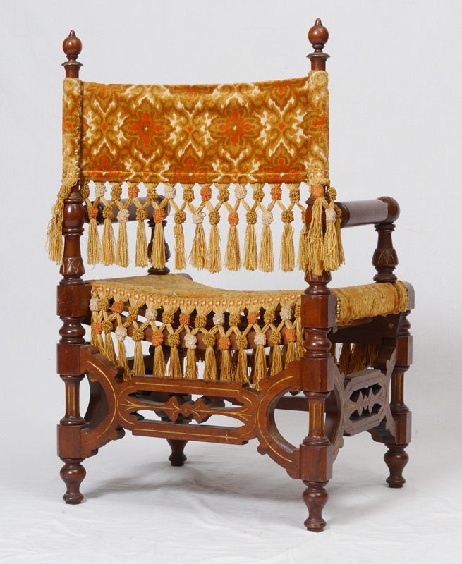 VICTORIAN RENAISSANCE REVIVAL ARM CHAIR: Diminutive arm chair with carved and turned frame. Heavy floral motif upholstery with tassels. Measures 34 1/4'' h. x 21'' x 18 1/2''.