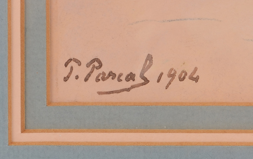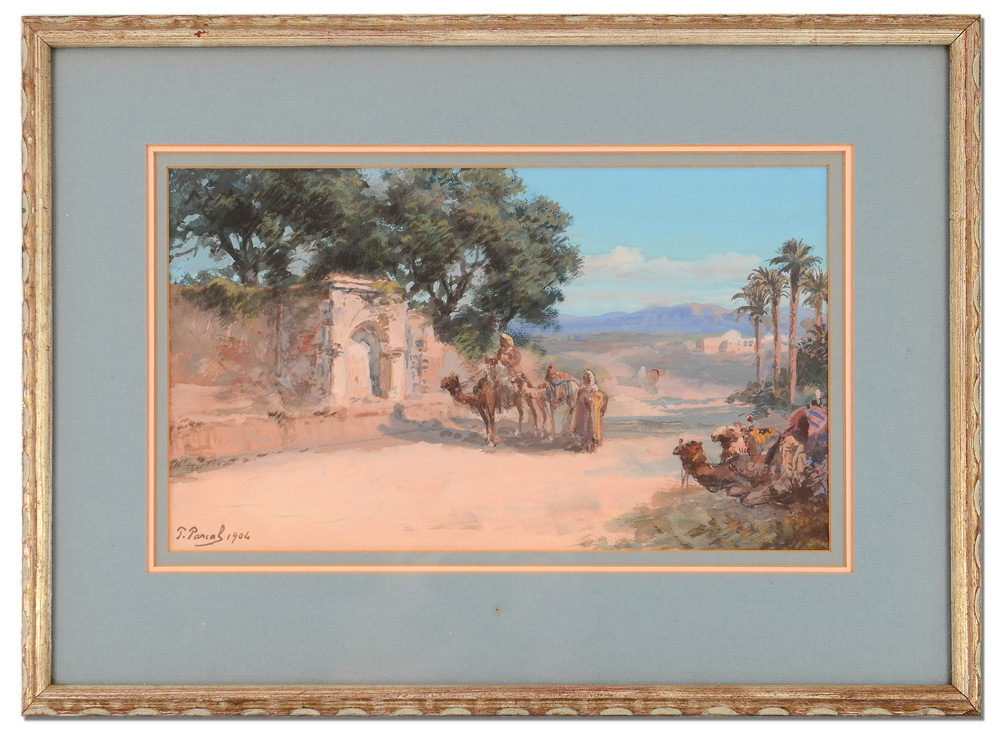 PASCAL, Paul B., (French, 1832-1903): Middle-Eastern Scene with Arabs and Camels in Village, Gouache, sight size 7 1/4'' x 12 1/2'', signed lower left and dated 1904, framed, 13 1/2'' x 18 1/2''.