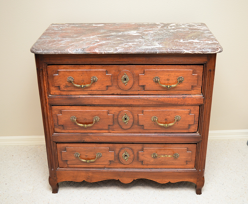 FRENCH WALNUT MARBLE TOP 3 DRAWER CHEST: Variegated marble top over 3 drawer base with fluted stiles, brass hardware, shaped skirt. Overall measures 35 3/4'' h. x 37'' x 21''.