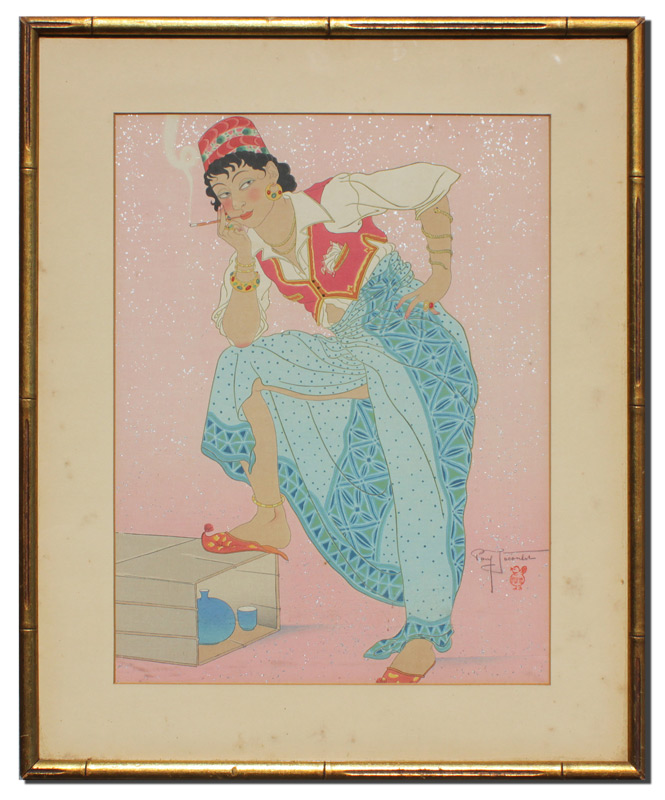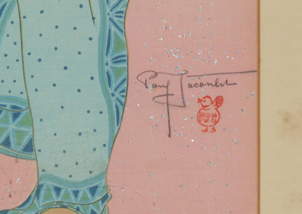 PAUL JACOULET COLORED WOODBLOCK PRINT ''L'ATTENTE'': Sight size 15'' x 11 1/2'', pencil signed lower right, encased in a gilded faux bamboo frame 20 1/4'' x 16 3/4''.