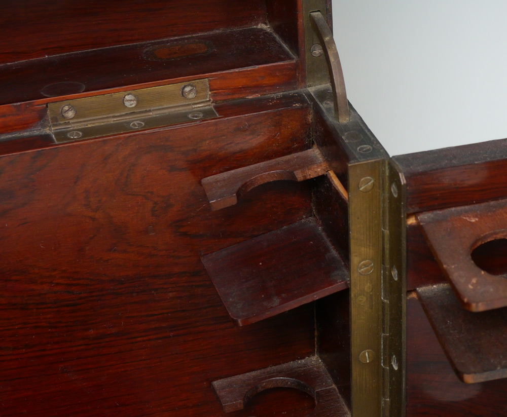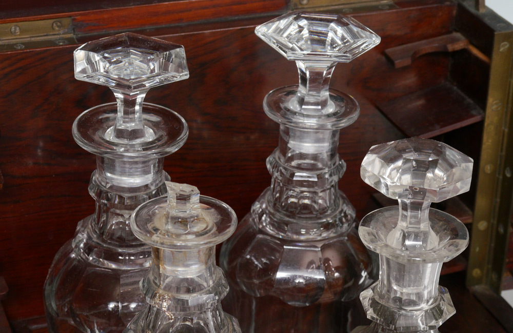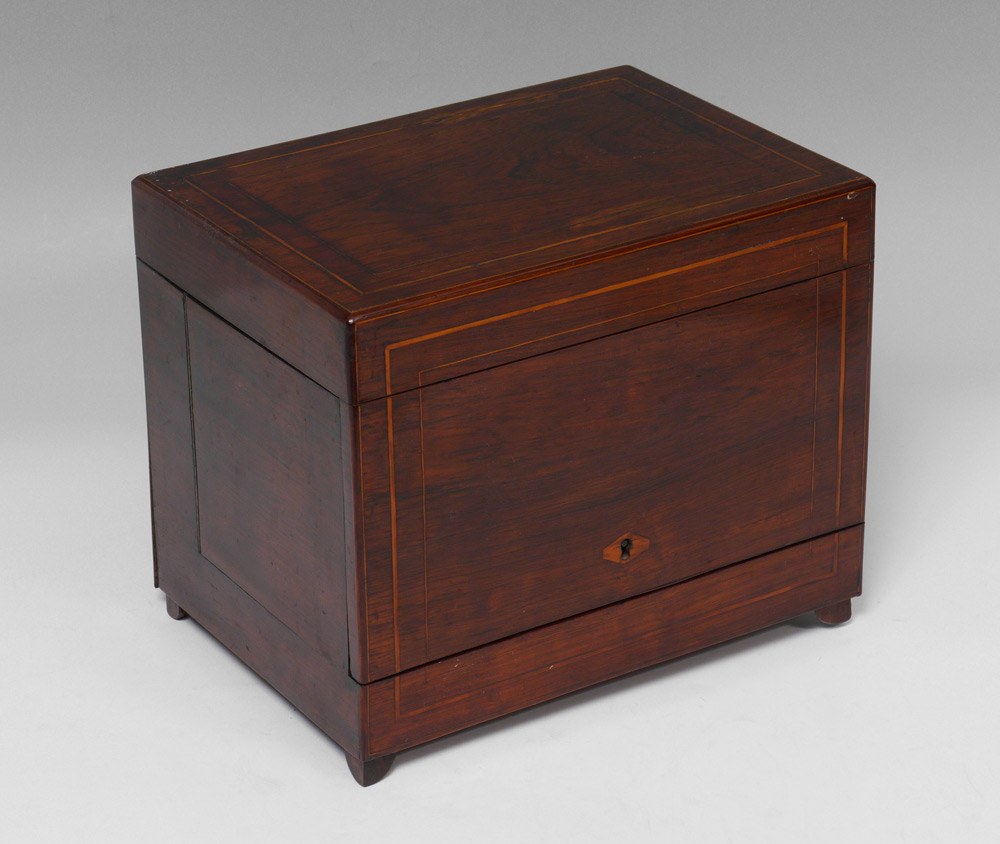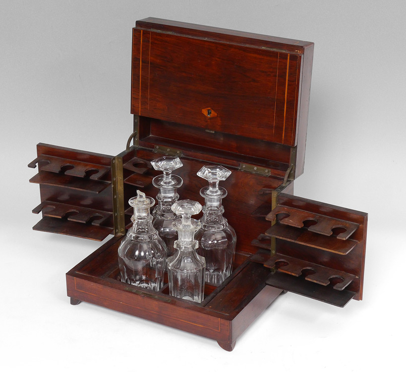 INLAID TANTALUS WITH CRYSTAL DECANTERS: Rosewood case with string inlay, opens to hold 4 decanters and space for 16 cordials. Measures 10'' h. x 12'' x 8''.