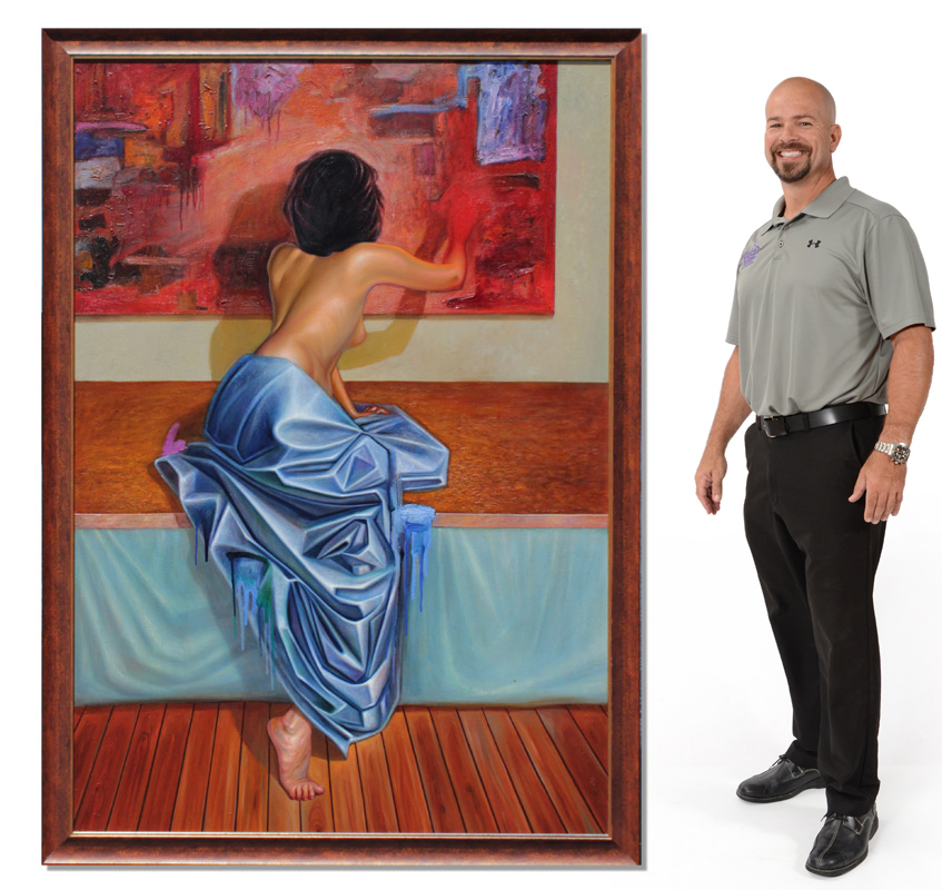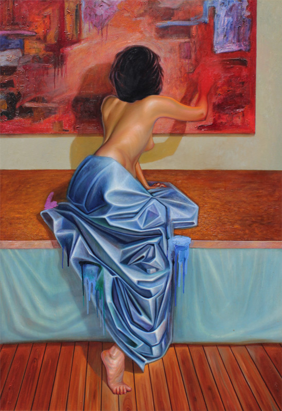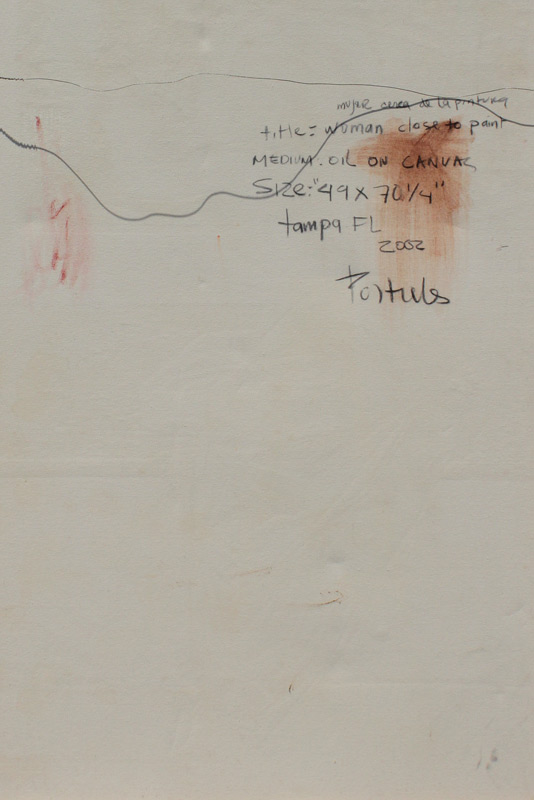 PORTIELES, Guillermo, (American, 20th Century): ''Mujer Cerca de Pintura'', Oil/Canvas, 49'' x 70 1/4'',signed in the front, dated 2002, signed and titled verso, contemporary frame 75 1/2'' x 54 1/4''.