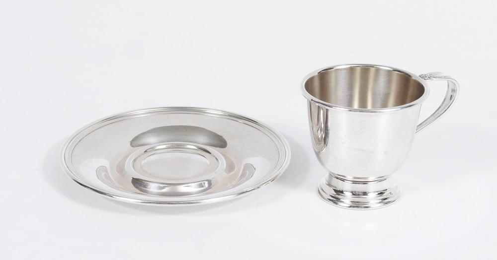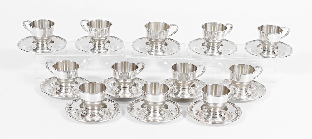 12 INTERNATIONAL STERLING DEMITASSE CUPS & SAUCERS: 24 pieces total by International Sterling to include 12 handled cups 1 7/8'' h. x 2 7/8'', 12 saucers 4'' dia. Approx. 28.2 troy oz.