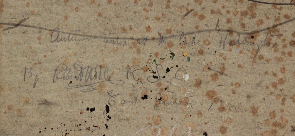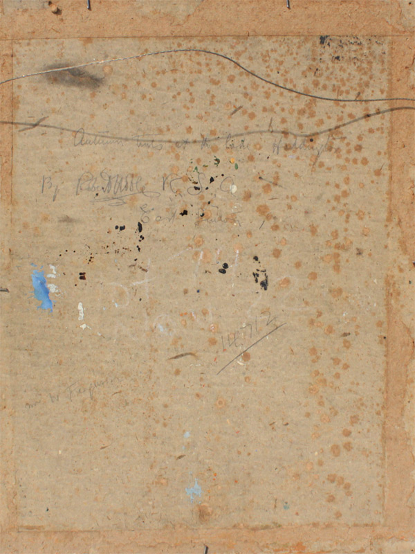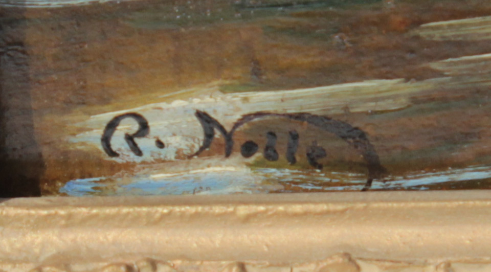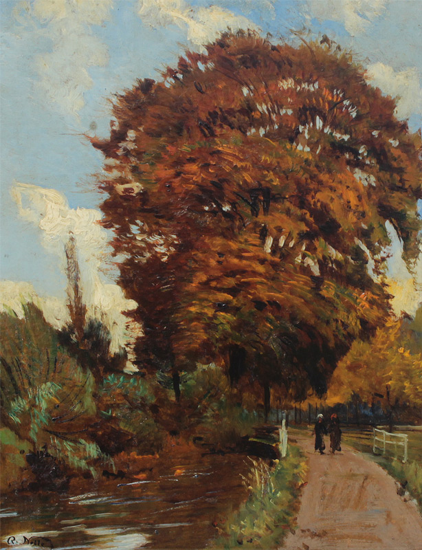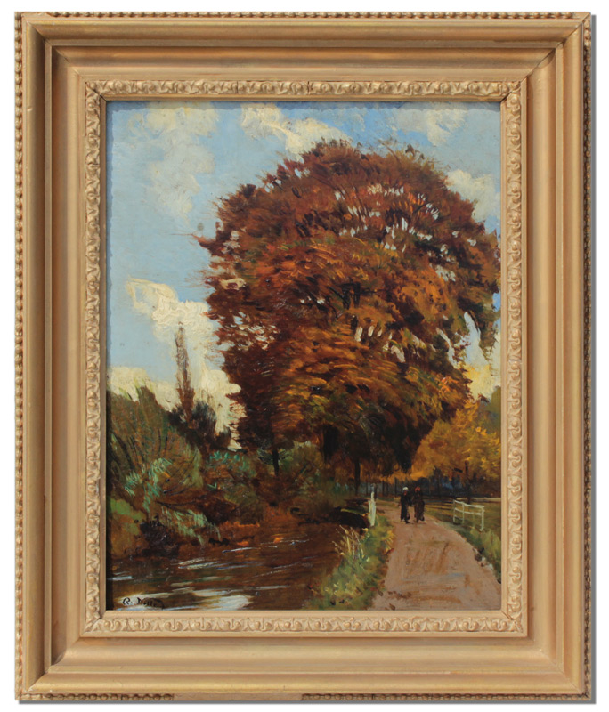 NOBLE, Robert, (United Kingdom, 1857-1917): Riverside Landscape with Figures Walking on a Trail, Oil/Cardboard, 14'' x 11'', signed lower left, framed 18 1/4'' x 15 1/4''.
