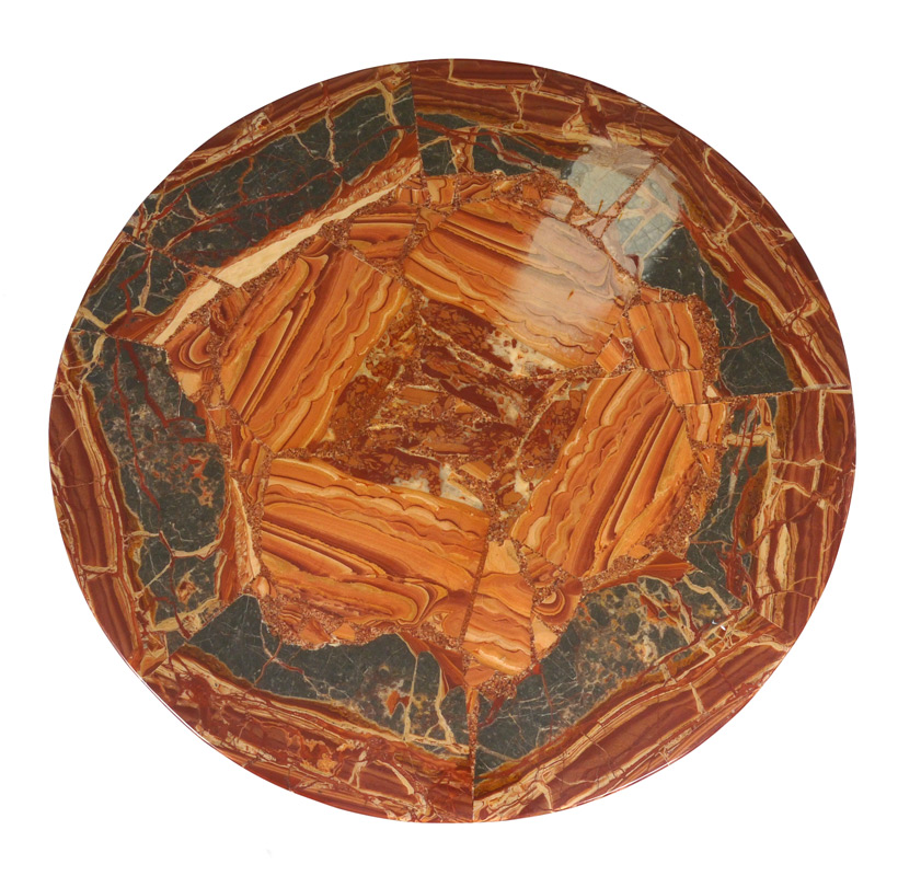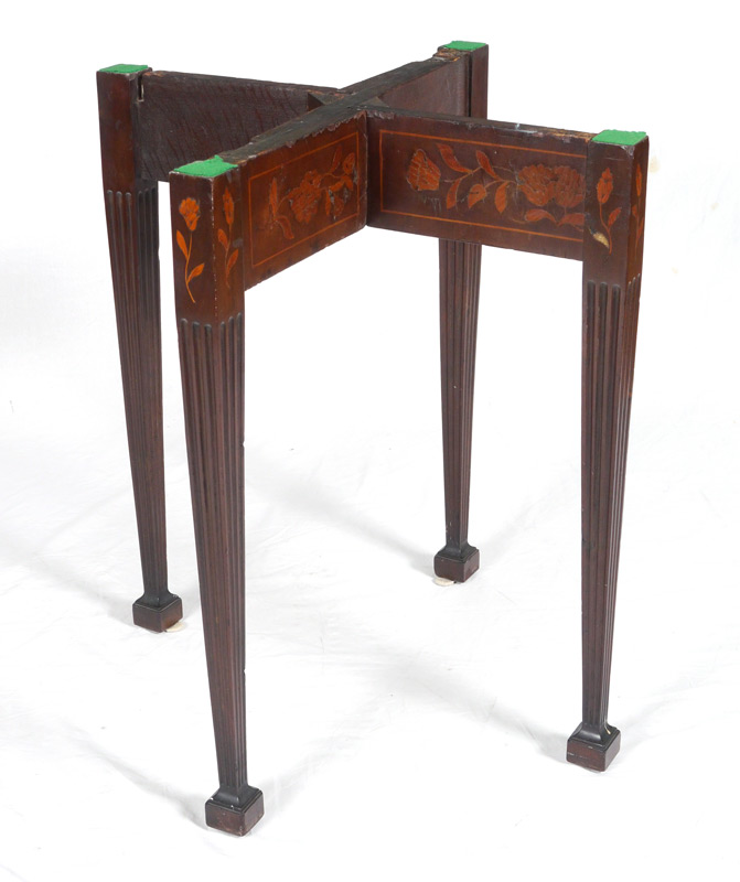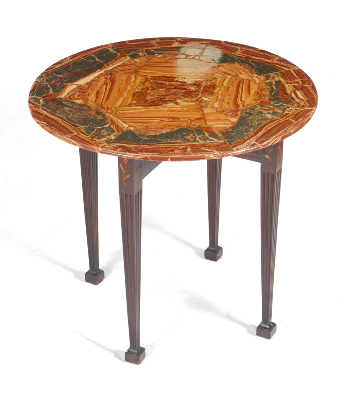 INLAID MAHOGANY MARBLE TOP SIDE TABLE: Specimen marble top with pie shaped pieces, mahogany base with floral inlay, tapered and fluted legs. Overall 29 3/4'' h. x 31 3/4'' dia.