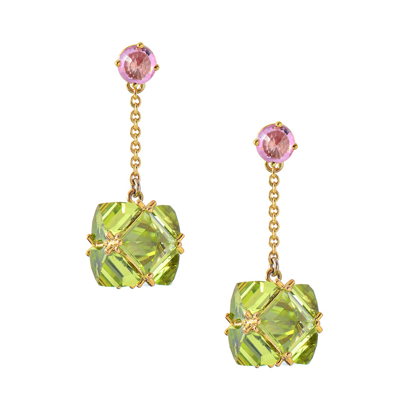 PAOLO COSTAGLI PERIDOT & PINK SAPPHIRE EARRINGS: From the PC Collection, 18K yellow gold earrings created with peridot and pink sapphires. The pendants measure approx. 12.25 mm. dia. Earring length 1.25''.