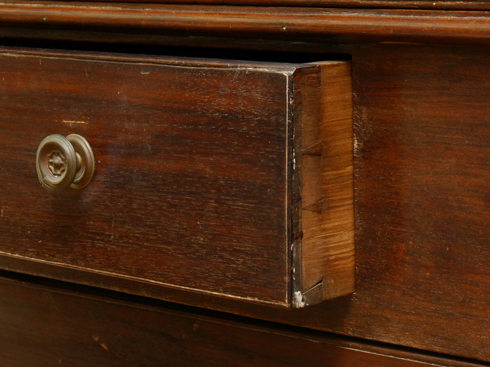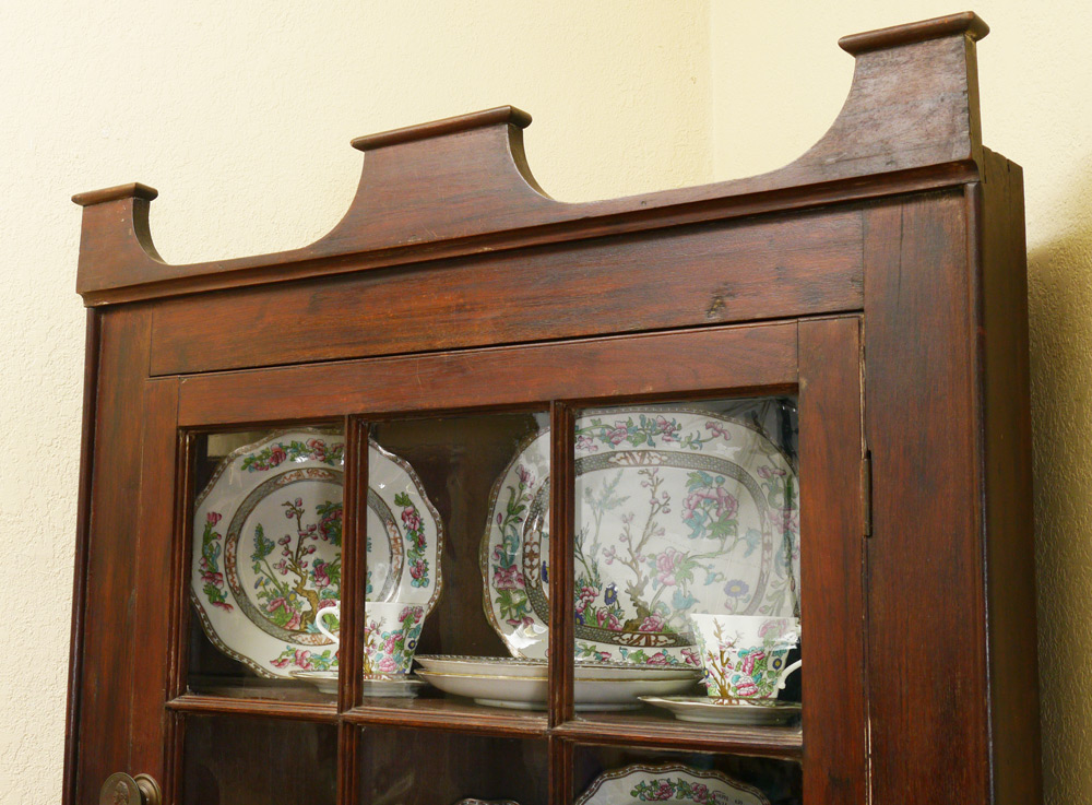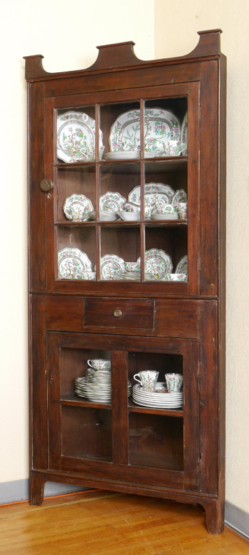 19TH CENTURY MAHOGANY CORNER CABINET: 9 light door top section with 2 serpentine wood shelves over small central drawer. Lower 4 light drawer with single shelf. Overall measures 79 3/4'' h. x 35'' x 18''.