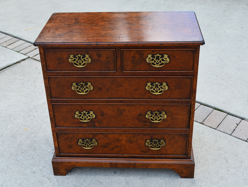 SOUTHAMPTON BURL WALNUT 2 OVER 3 DRAWER CHEST: Burl walnut veneer, 2 half drawers over 3 graduated full length drawers. 31 3/4'' h. x 29 3/4'' x 15 3/4''.