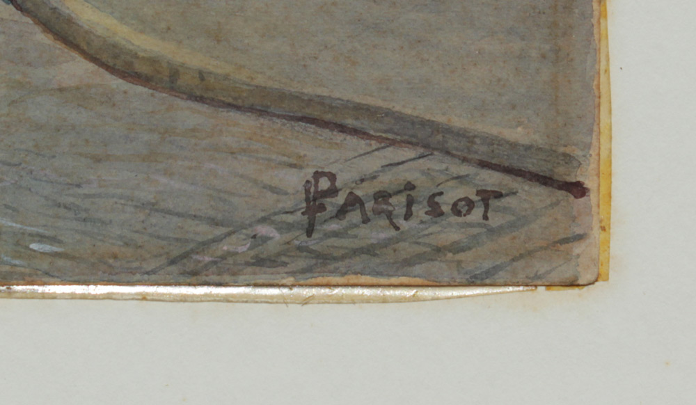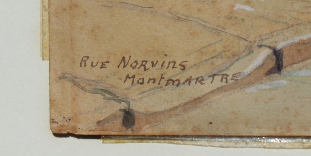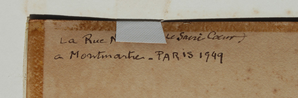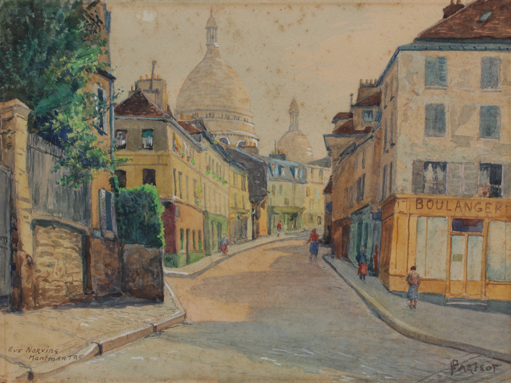 ROUGE NORVINE, MONT MARTRE FRENCH STREET SCENE SIGNED PARISOT: Watercolor, 9 1/2'' x 13'', signed lower right, titled lower left also titled verso, dated 1949, hinge mounted to the back board, framed 16'' x 19''.