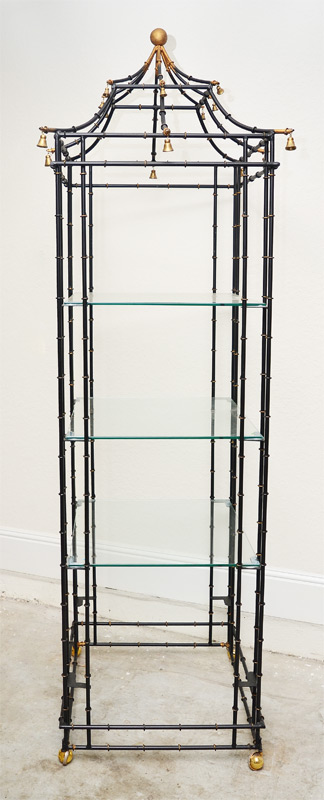 ORIENTAL STYLE CAST METAL BAMBOO ETAGERE: With an oriental flair, faux bamboo cast metal frame with 3 open glass shelves, traces of gilt remain. On 4 castors, overall measures 85'' h. x 23'' x 23''. For a pair see next lot 1152.
