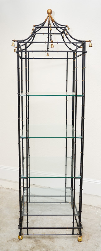 ORIENTAL STYLE CAST METAL BAMBOO ETAGERE: With an oriental flair, faux bamboo cast metal frame with 4 open glass shelves, traces of gilt remain. On 4 castors, overall measures 85'' h. x 23'' x 23''. For a pair see previous lot 1151.