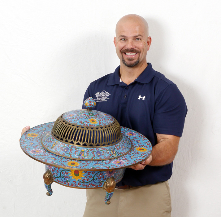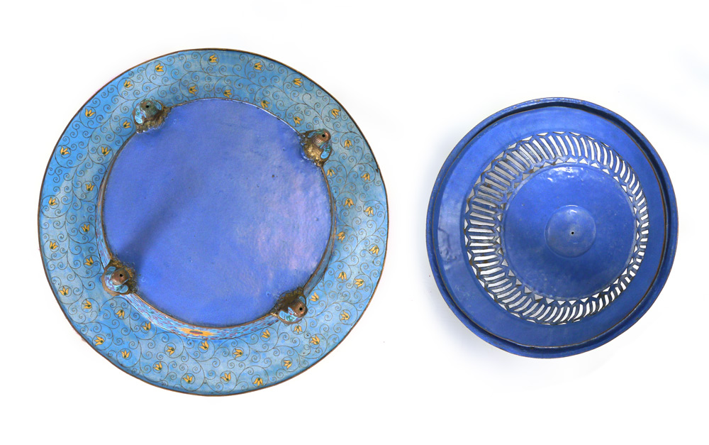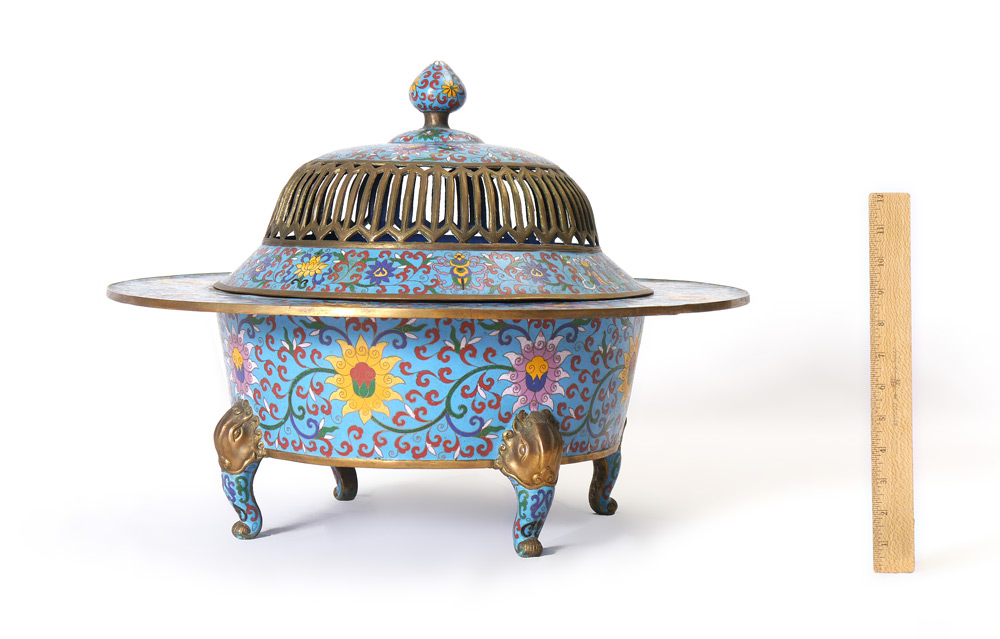 LARGE CHINESE CLOISONNE BRAZIER: Floral motif cloisonne on light blue ground. Removable lid, on 4 shaped legs. Overall measures 16 1/2'' h. x 22 1/4''.