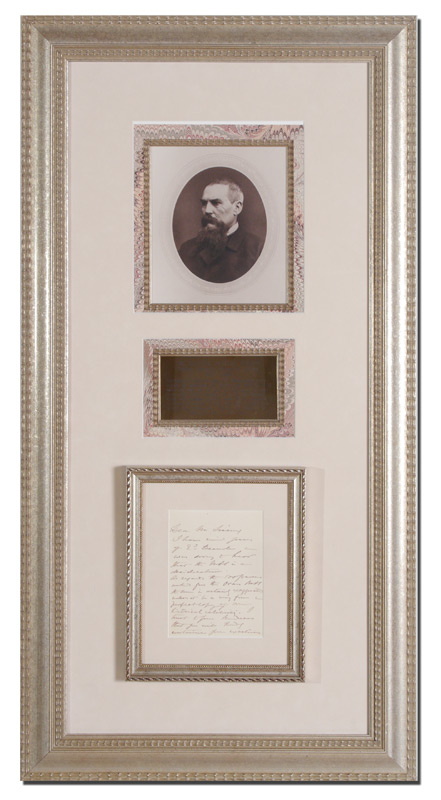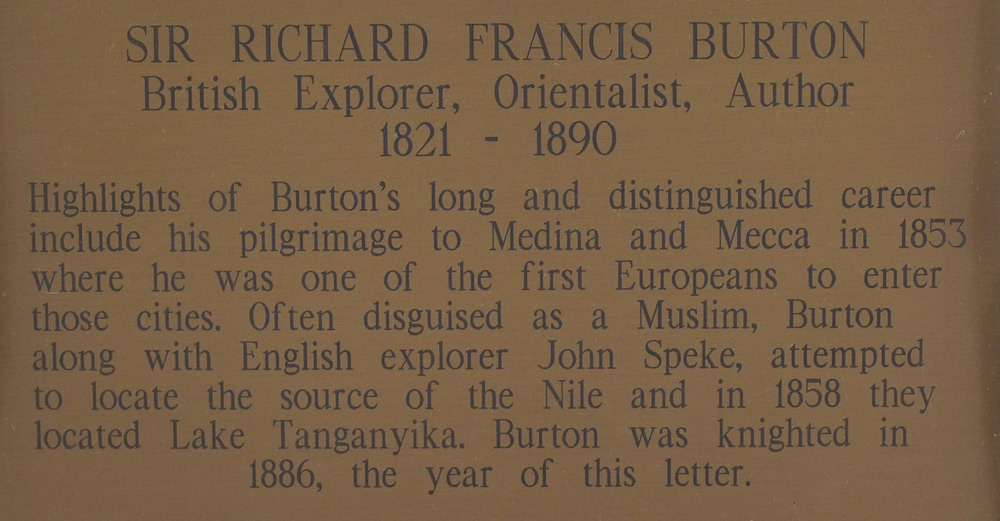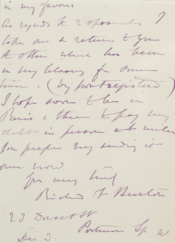 1886 SIR RICHARD FRANCIS BURTON AUTOGRAPHED LETTER: Hand written letter signed by English explorer and author Sir Richard Francis Burton, 2 pages folded 8vo, Burton writes to Mr. Tiseng, ''I have received? of 2 December and was sorry to hear that the MSS is a desideratum. As regards the 500 francs asked for the Oran MSS the sum is certainly exaggerated unless it be a very fine and perfect copy of a new historical celebrity. I trust to your kindness that you will kindly continue your exerations in my favor. As regard to the 2 oposcules I take one and return to you the other which has been in my library for some time (by Postrepistero) I hope soon to be in Paris, then to pay my debt in person unless you prefer my sending it over now. Richard F. Burton'', in blue ink. Framed in double glass frame with both sides visible. Sight size 6'' x 4 3/8'', framed 10 '' x 8 1/2''. Sold with and additional frame with plaque and engraving of Burton 36 1/4'' h x 185 3/4'' x 1'', and a COA from Paper Treasures in Palm Beach.