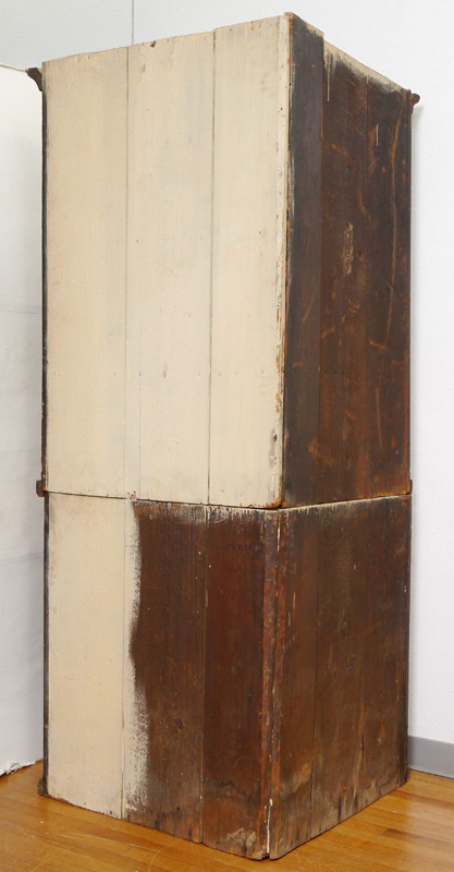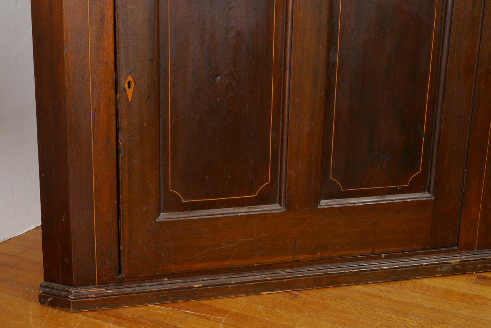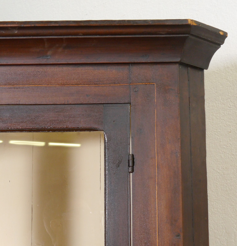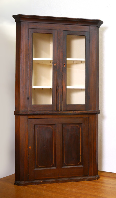 INLAID CORNER CUPBOARD: String inlay decoration, top with 2 glass front doors, 2 wood shelves. Blind single door base. Overall 80 1/2'' h. x 46'' x 26''.